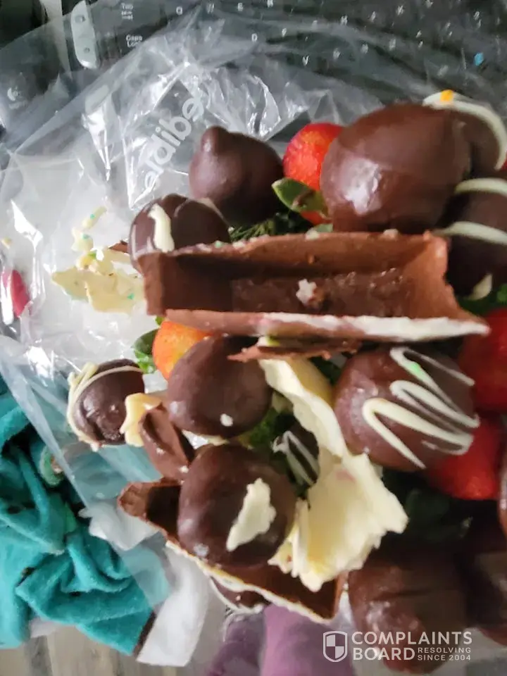 informed by the recipient that her edibles were left outside and by the time she got to her arrangements, the fruit was no longer good. (It was left outside in 80-degree weather)