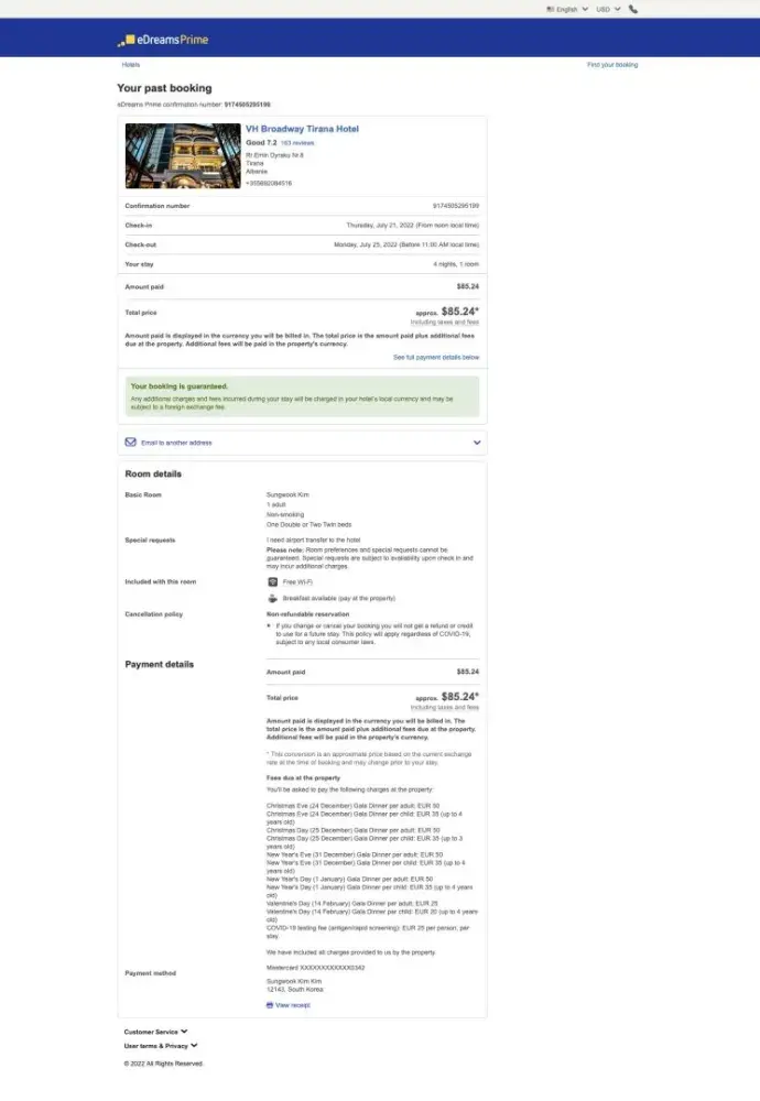 Desired outcome: I should have checked in the 3star Hotel, VH Broadway Tirana Hotel for 4 night, 5 days.