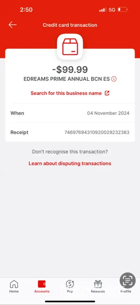 An amount of 64.99 euros was debited from my account under the description "EDreams Prime- Barcelona, Spain on 19th of Feb 2024 with transaction number 2402190800501580050158681." However, upon reviewing my recent transactions, I cannot recall applying for any such service or making any bookings with e Dreams in recent days. As such this deduction appears to be possibly unauthorised activity on my account.