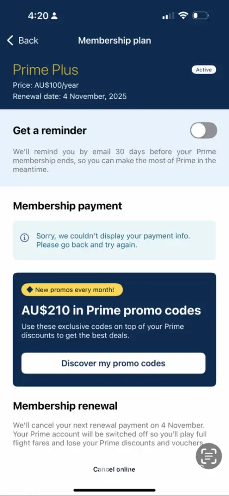 I have paid for my Prime account twice, but was told that it is not active by a very unhelpful customer service agent. I didn't bother with pursuing the double charge since customer service with eDreams is such a nightmare. However, when I go to remove my credit card information from eDreams it tells me that I cannot while my Prime account is still active...
