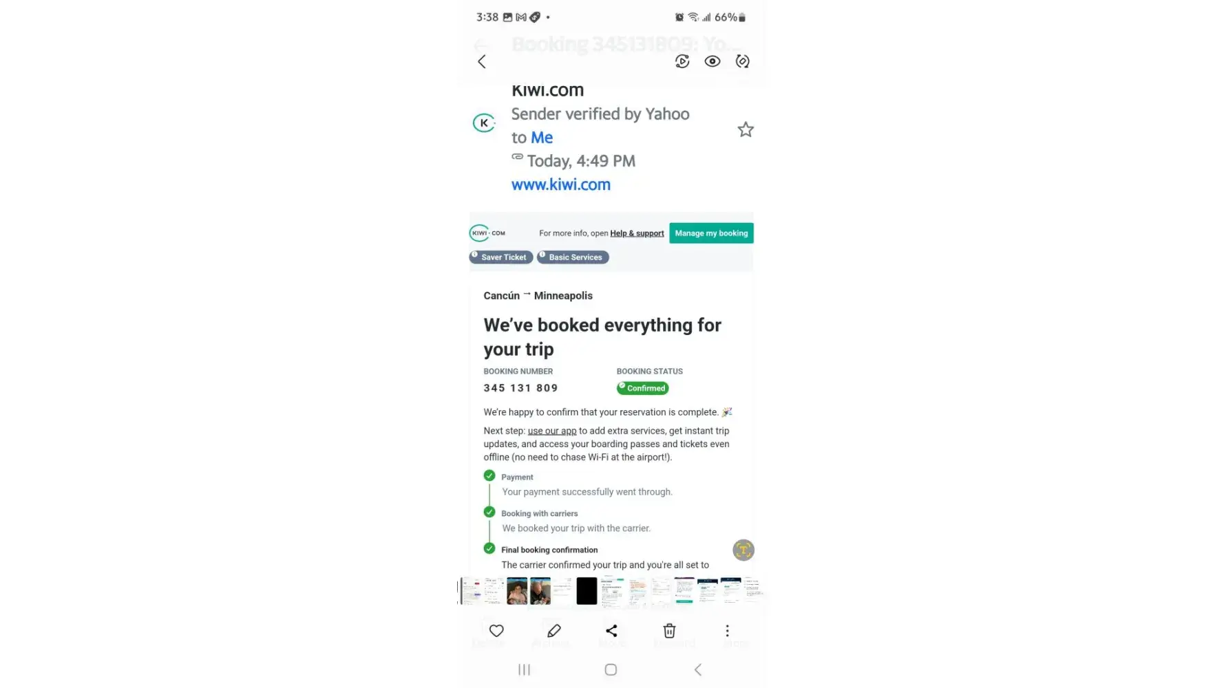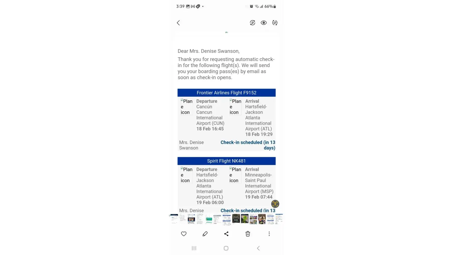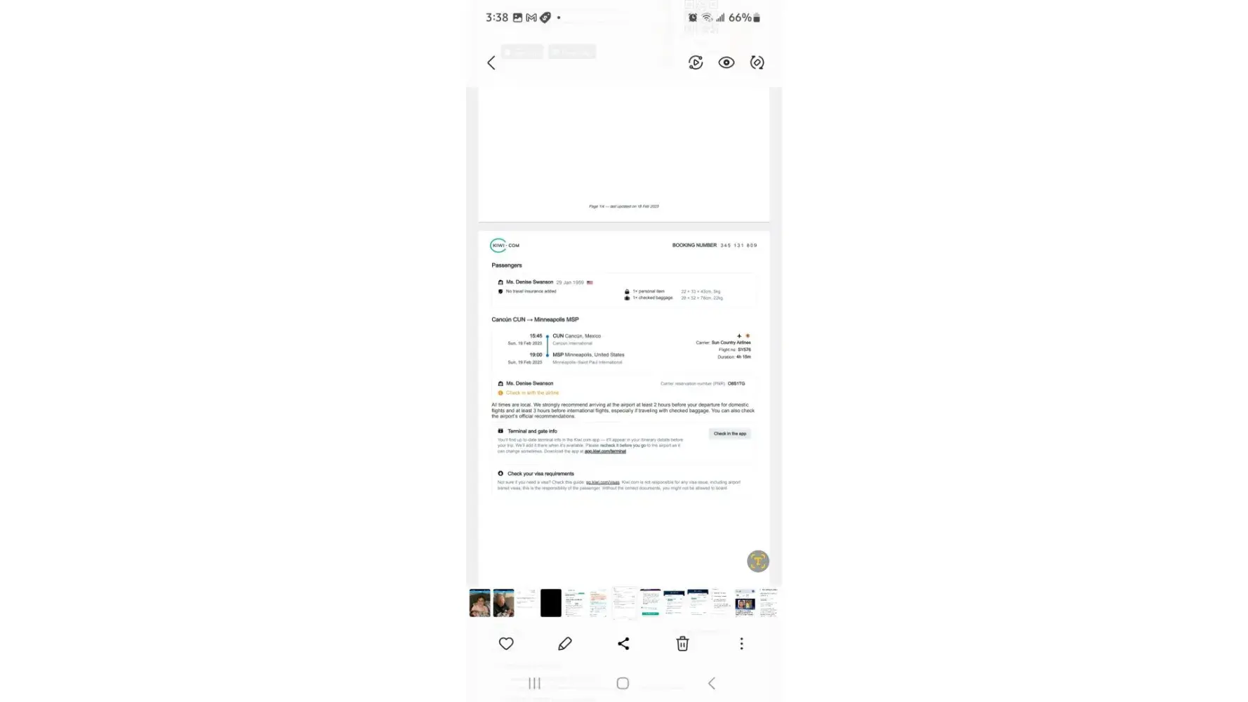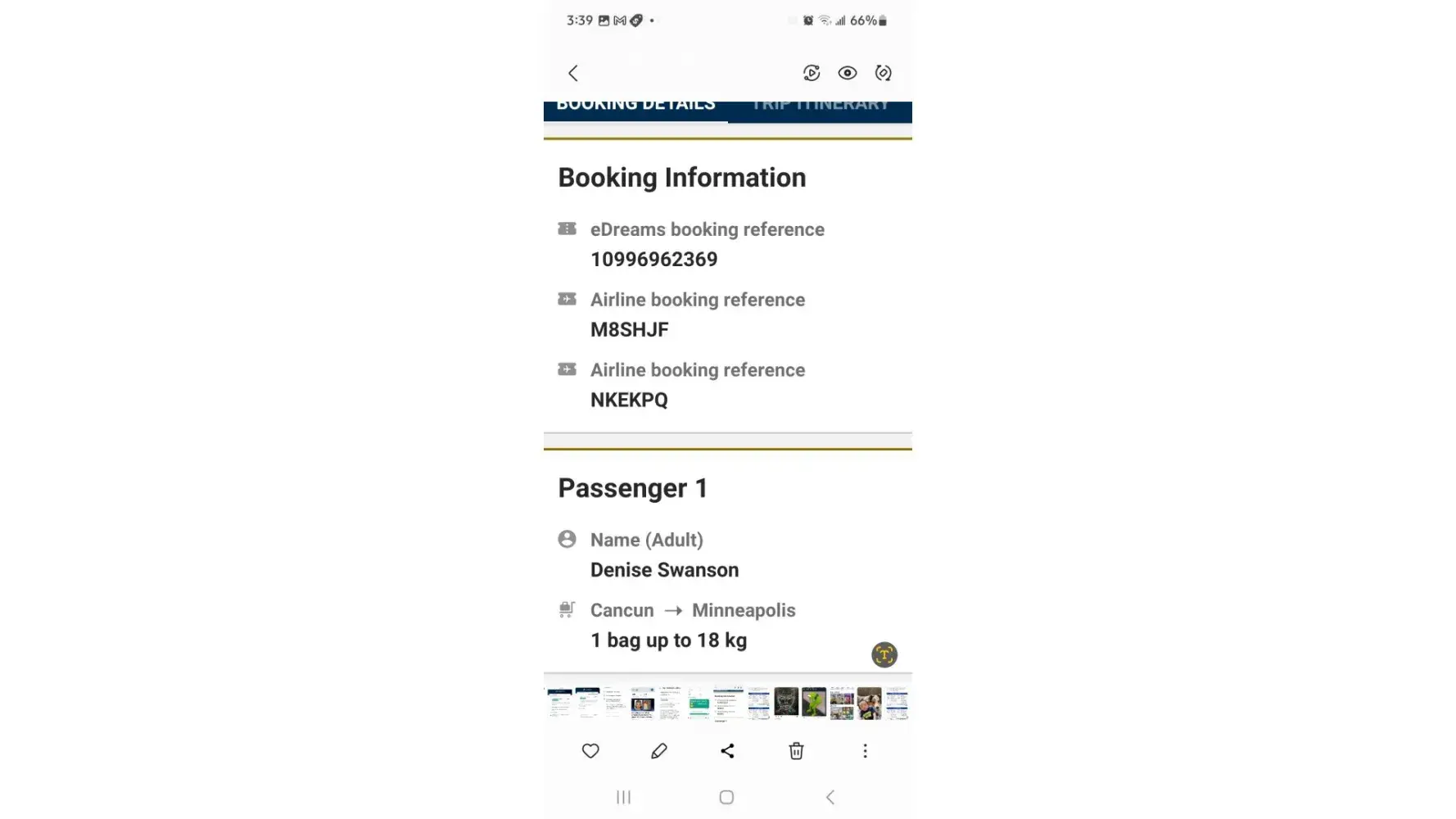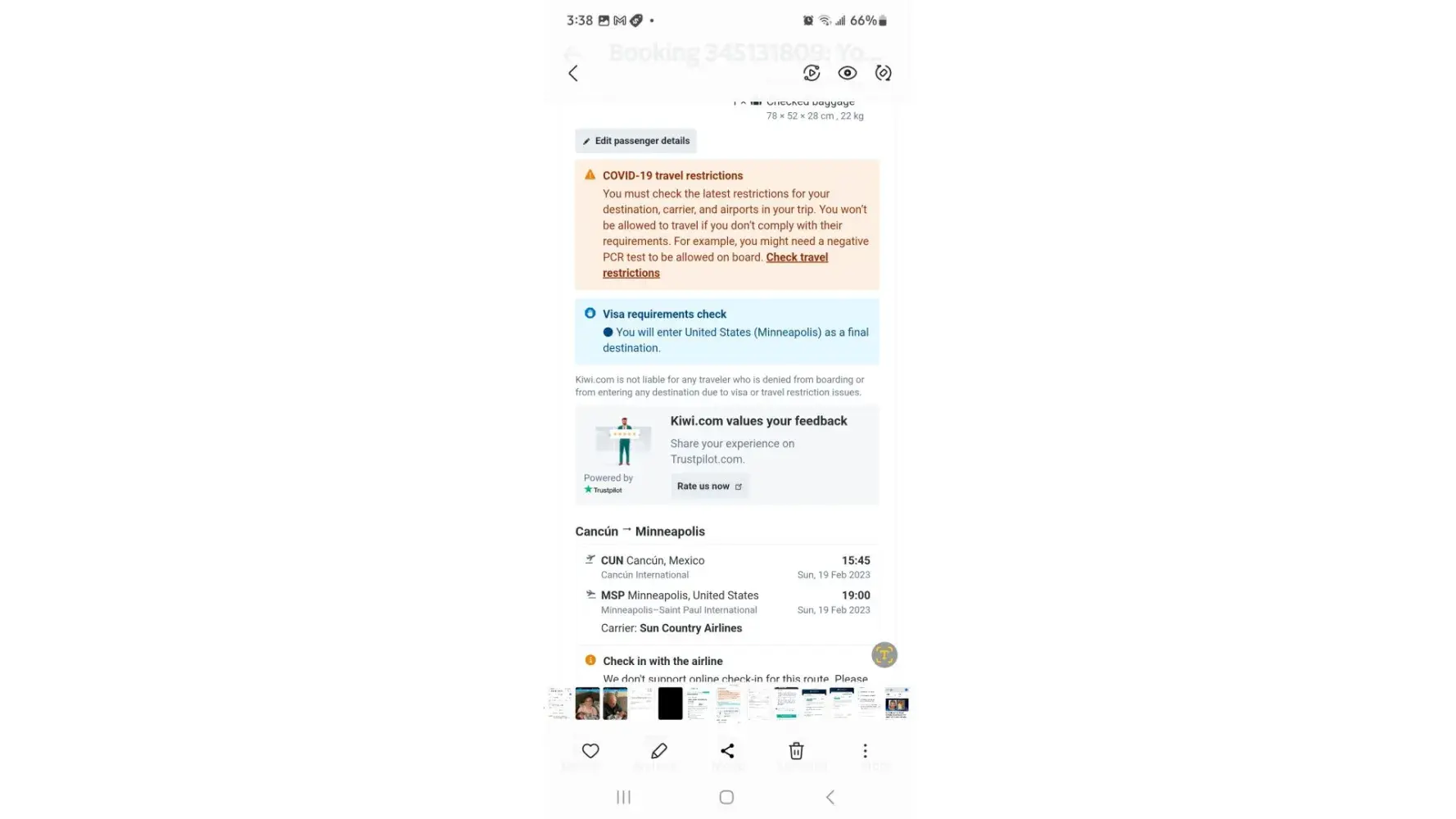 I had a trip from MSP to Cancun Mexico t h e flight there was on time and worked fine but the flight home was canceled not by m e I had no cell phone service. I had to book a flight home for $20 more dollars & plus 3 meals and taxi and hotel . I was assured that my flight was confirmed by edreams ! The flight was Feb 18th on Frontier & spirit Air lines the flight # are on the photos. Frontier f9152 & Spirit NK481
