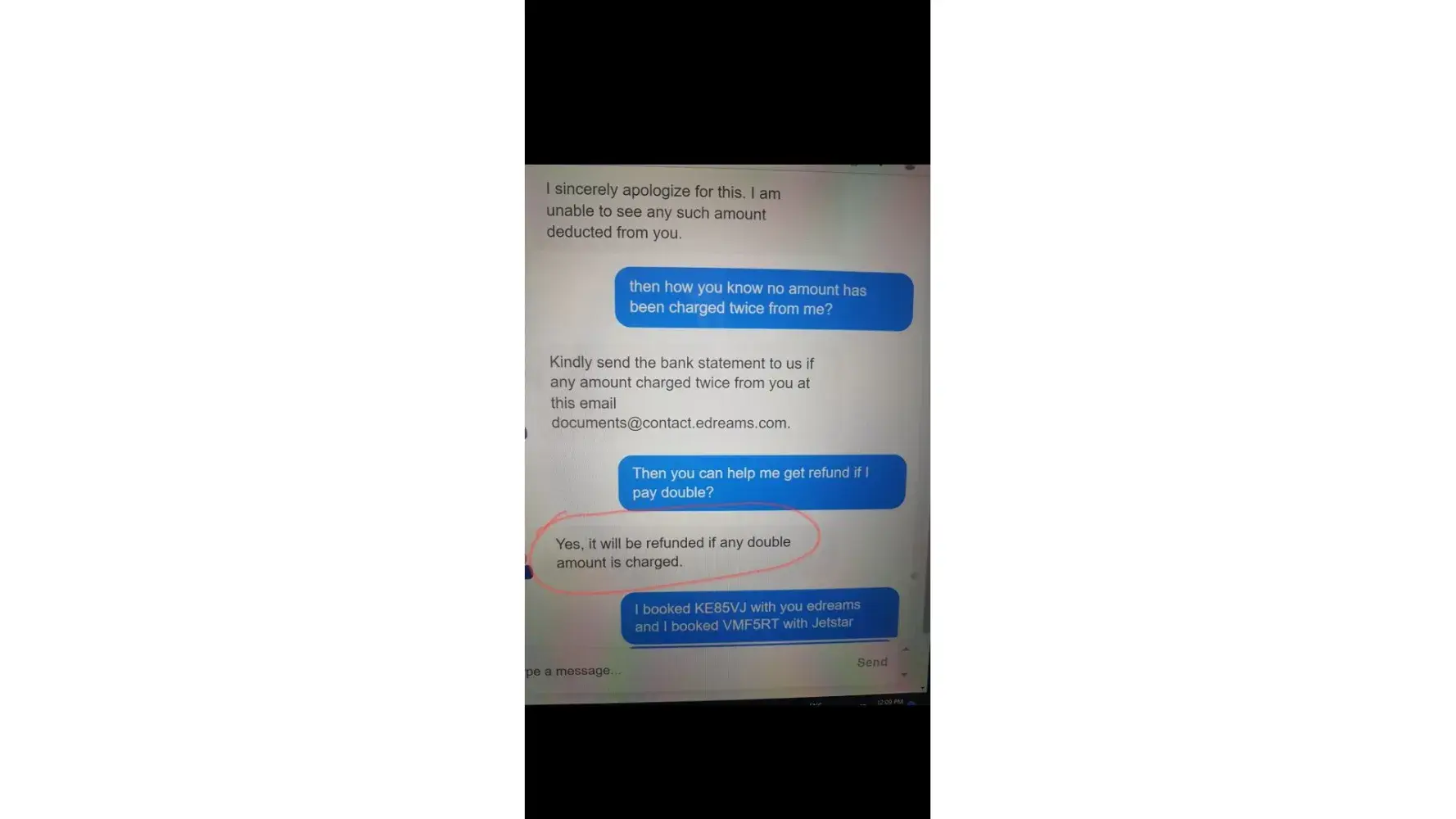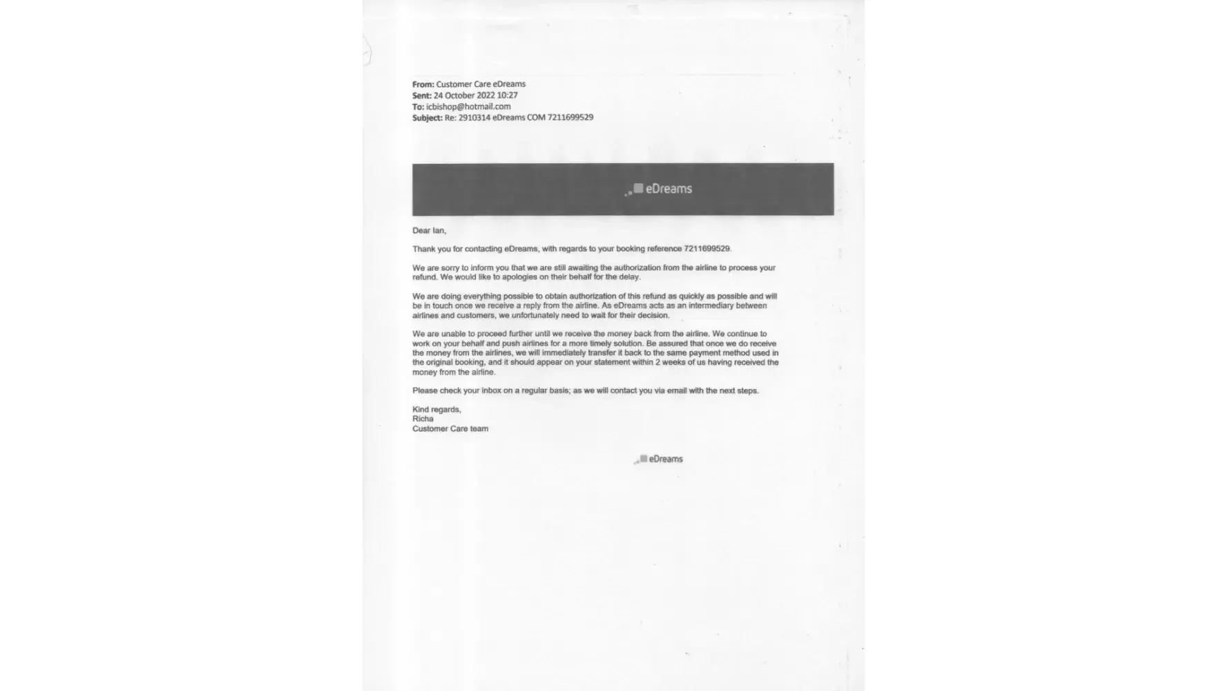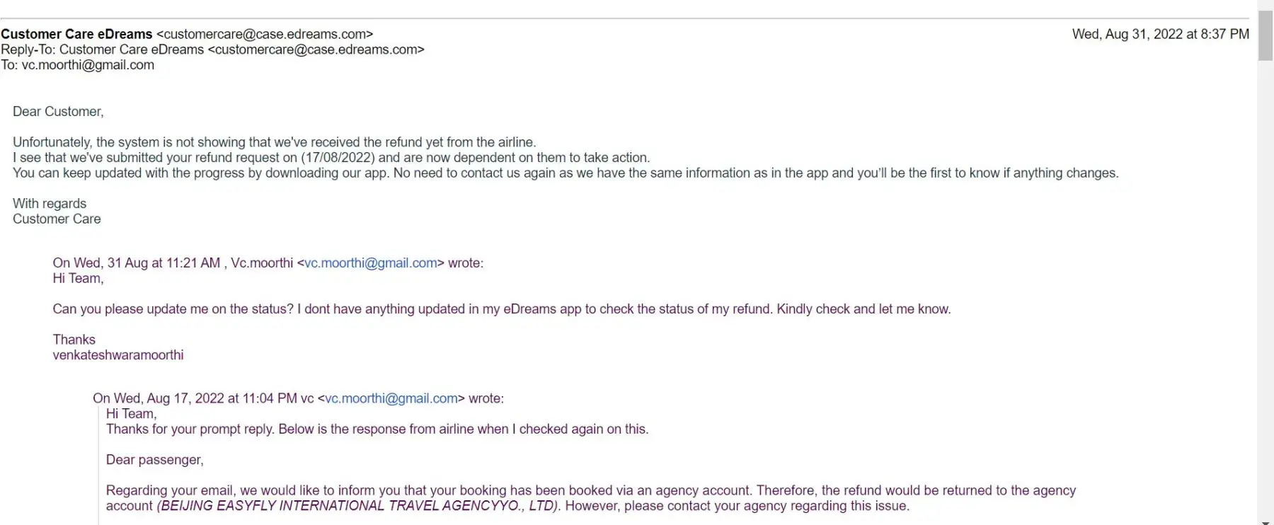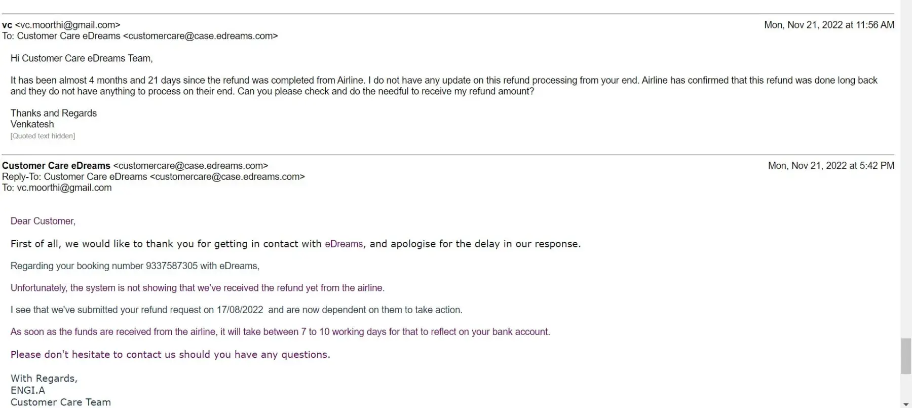 I booked the tickets through eDreams in June 2022 and the airline cancelled the one-way ticket which I had to rebook at a higher cost later. When I followed it up with Airline, they shared me screenshot of the refund completion and asked me to check with eDreams as it was done through eDreams. This refund from Airline was done on 1st of August 2022. When I shared the screenshot with customer service, they have sent me this response.