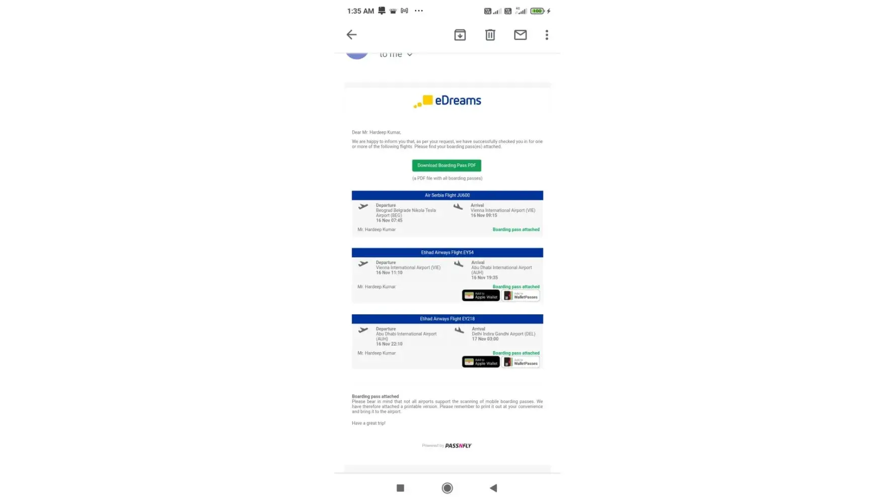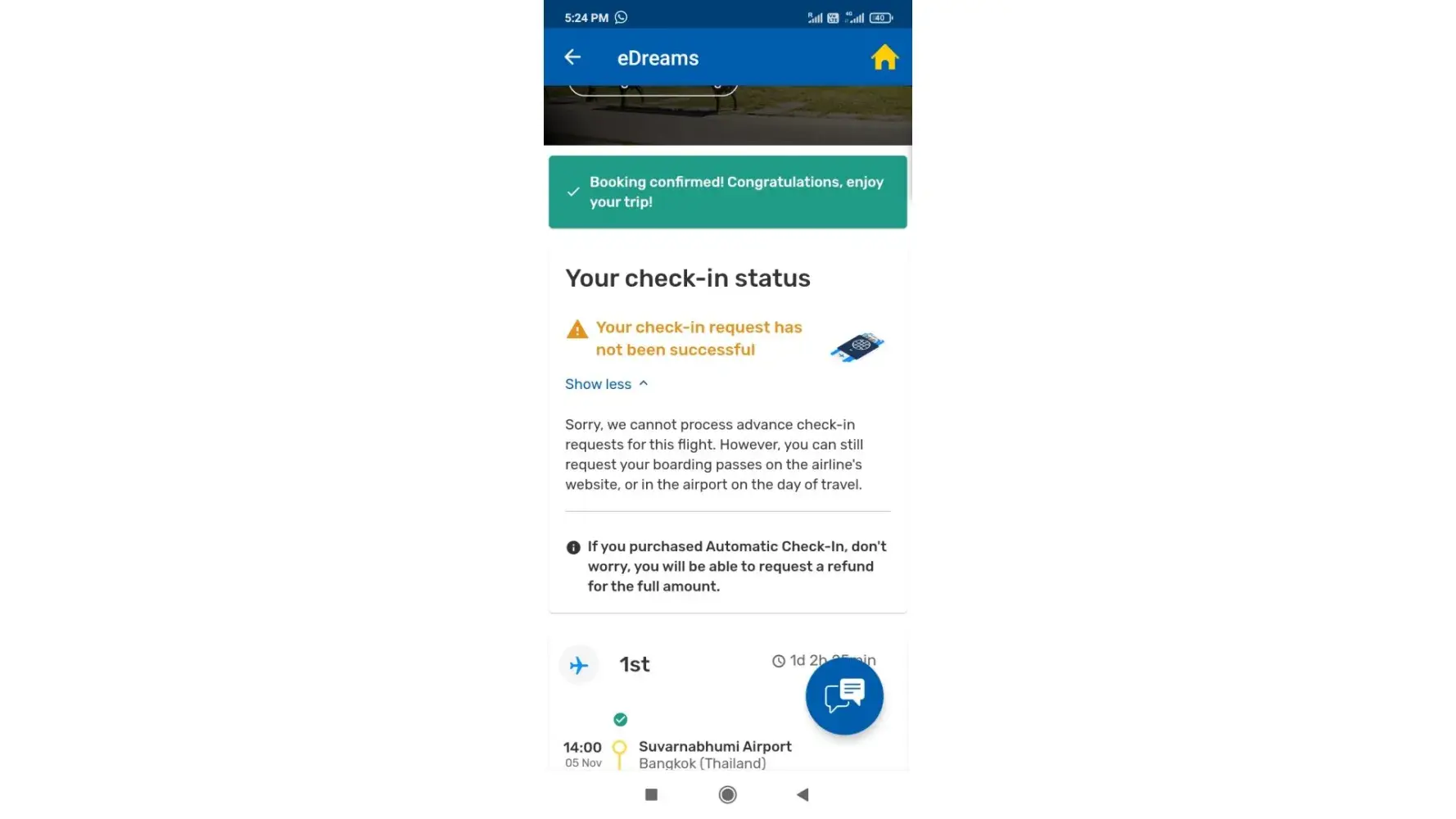 Edreams is a cheater company I booked flights from Bangkok to serbia with automatic check in boarding pass where it show if boarding denied u get full refund they just cheated me since 5 nov 2022 it's not a professional company they just know how to take money from customers pocket,called many times n sent many emails even there agents lie lot I will never recommend someone book with edreams I have all proofs I lost inr approximately 75000