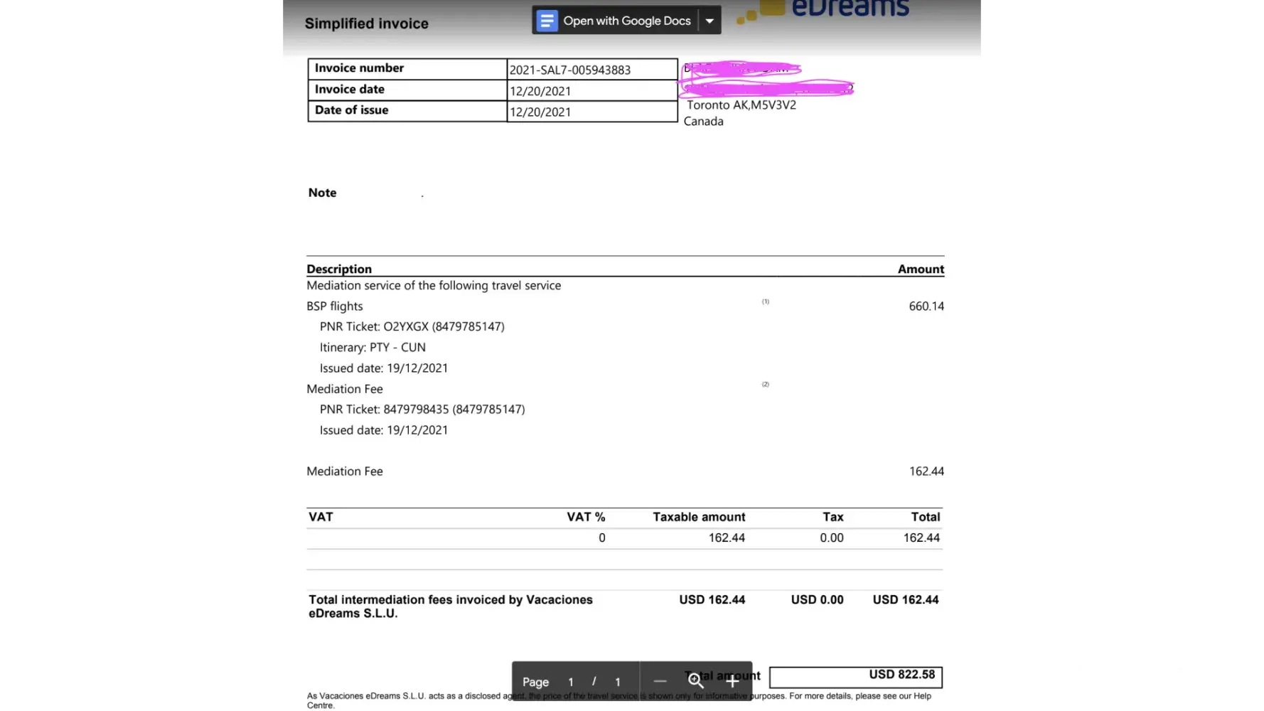 23/08/22 - I online requested an invoice from eDreams (realising they had not provided me with the same when sending me their booking confirmation on 08/02/22. e-Dreams sent me a "Simplified Invoice" that did not itemise the purchases I selected online on 08/02/22.