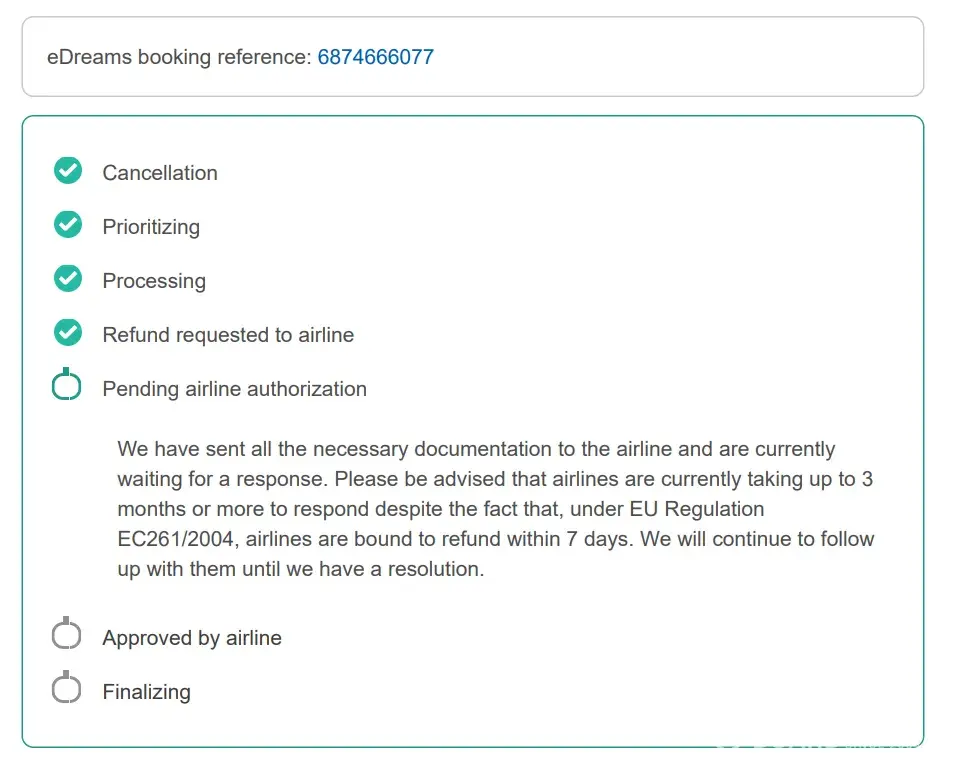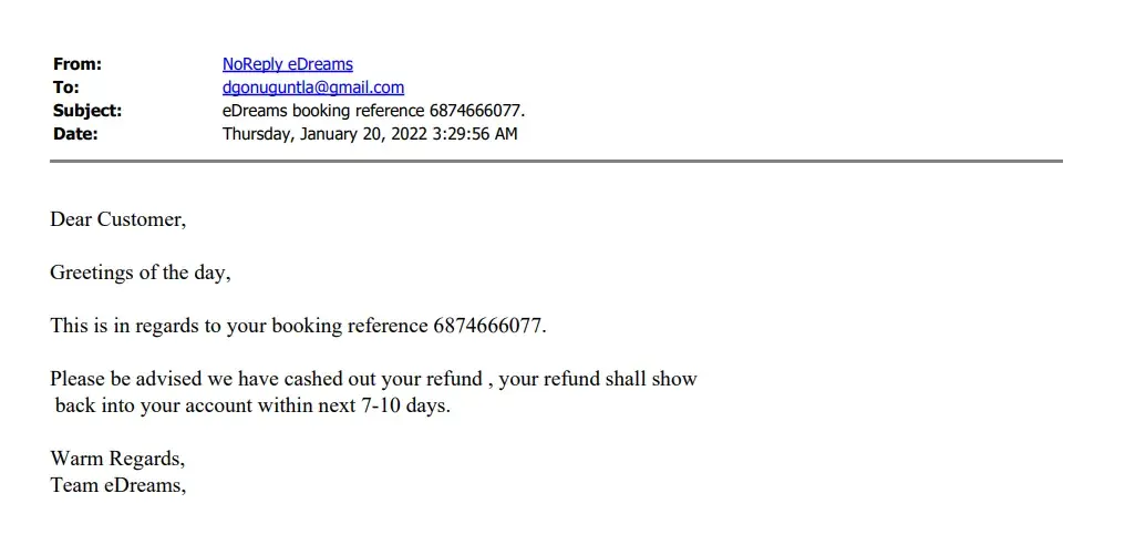 EDreams continues to say that they are waiting for airlines to refund the funds. In Jan, 2022 EDreams confirmed that they would refund the funds but that never came around. This is refund from 2021.