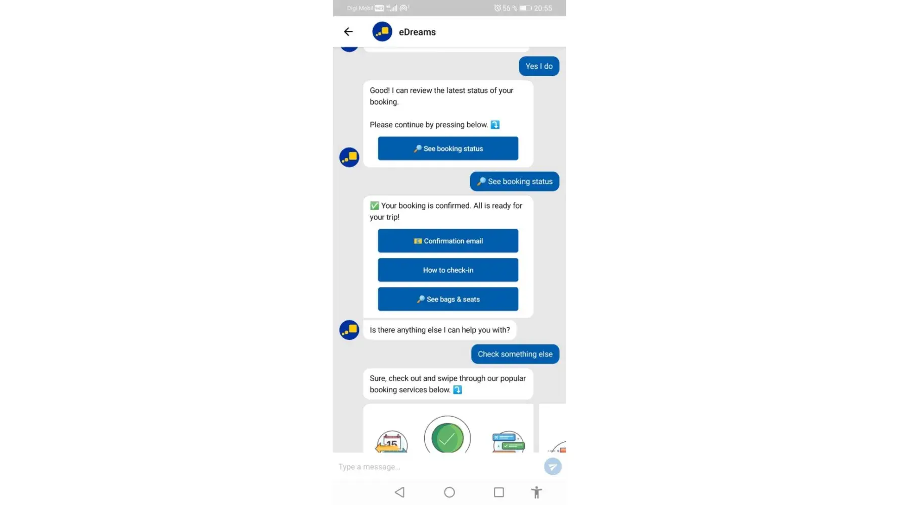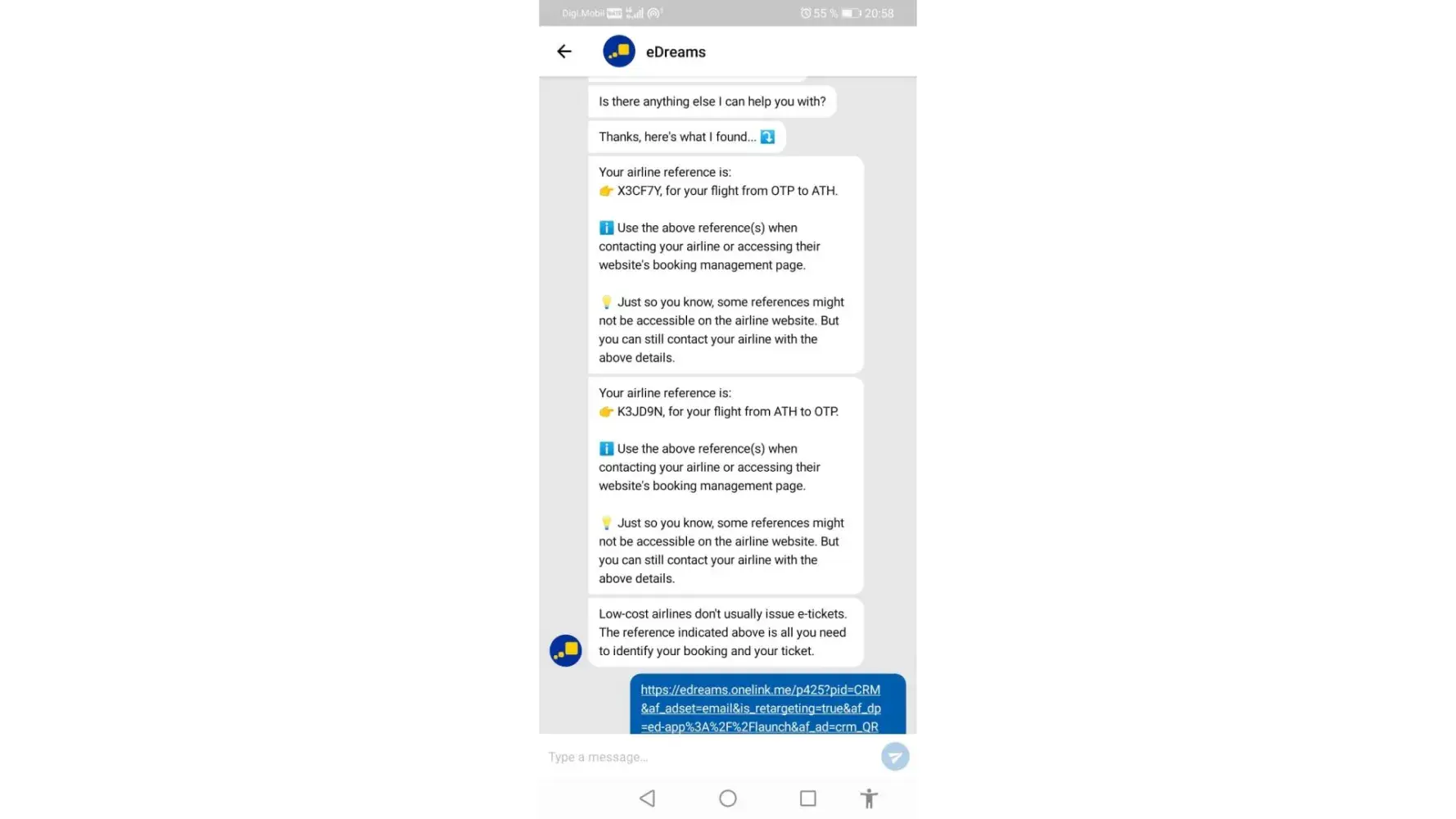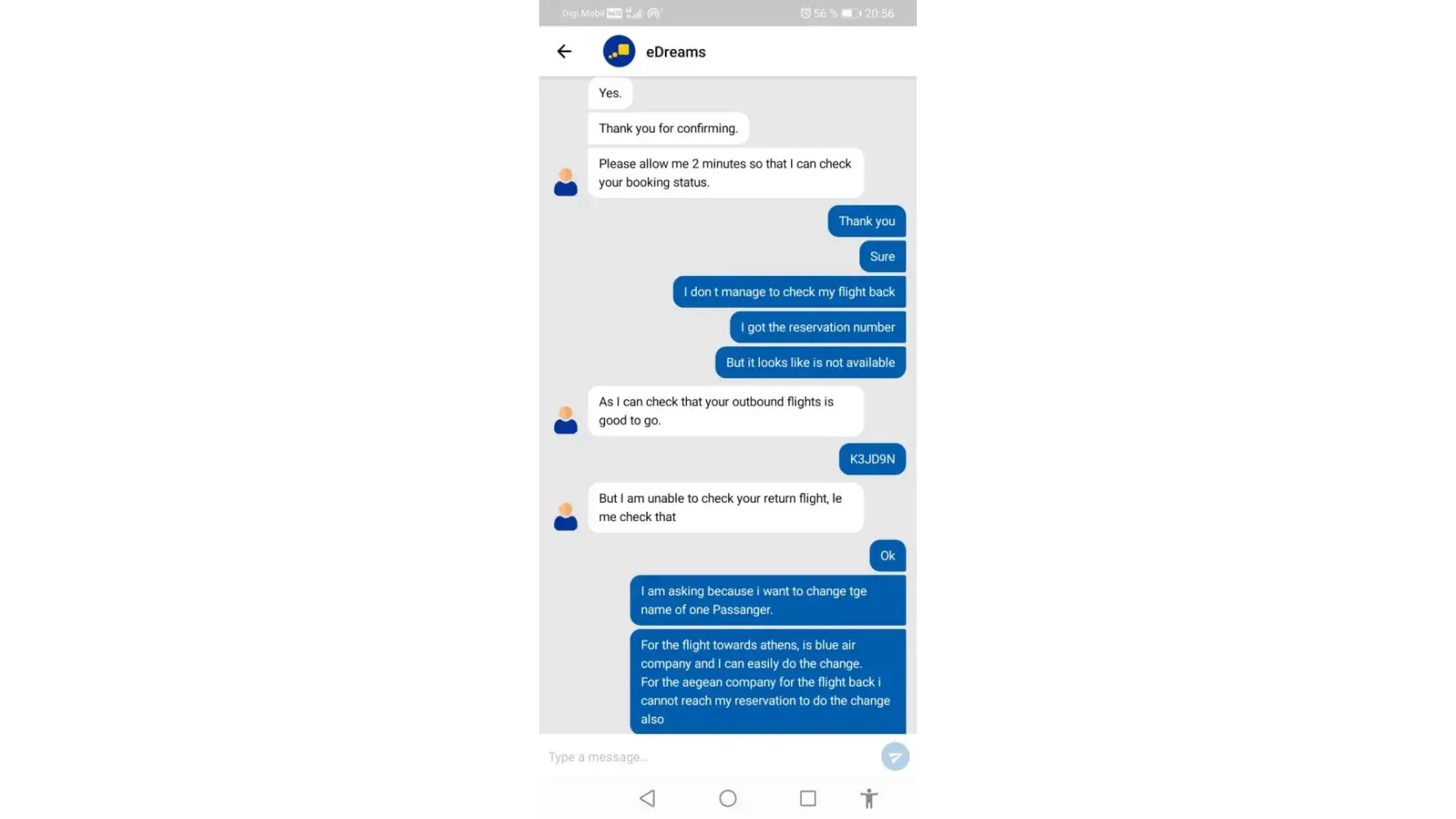 Prior to the day of flying back, I tried to do the check-in online and it didn't work. I talk then with someone from eDreams on the chat box and he/her assured me in several times that our flight "is good to go". In the morning of the return flight, we were sent by the aeroport stuff to the Aegean Company desk. They couldn't find our tickets and they told me that is not their fault and eDreams should fix the problem. Than, I contact edreams again on the chat box and they said that a refund is on the way because the airline canceled our flight tickets on midnight prior our flight.