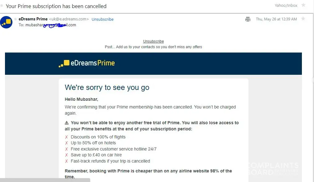 Once becoming a prime member by providing bankcard details, the login was changed to deny us access to the portal. Duplicate flights (x2 each time) were purchased on top of the ticket we bought. Flights identified these and notified us as the email had been changed in the portal and we were only sent the flights we booked. Purchases were made via the EDreams App in Barcelona as well. Trying to contact the service centre is fruitless, it is only a recorded message asking for a flight booking number and then hanging up. There is no actual customer service centre in Australia to deal with this.