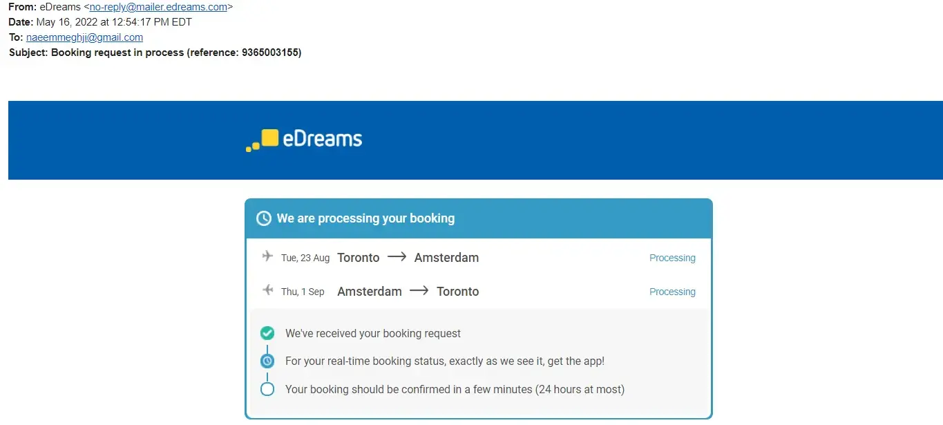 I have used the same application for airplane tickets since 2019, and for this purchase I used it again. After I performed the search, edreams came out as the best offer, and I have choosen them...I entered all the information they asked