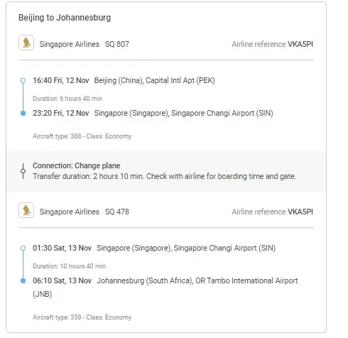 I attach all the information and confirm that I have booked my ticket from Beijing, China to Johannesburg, South Africa on 21 March 2021. The flight details are as follows: From Beijing to Johannesburg on Friday, 12 November 2021.