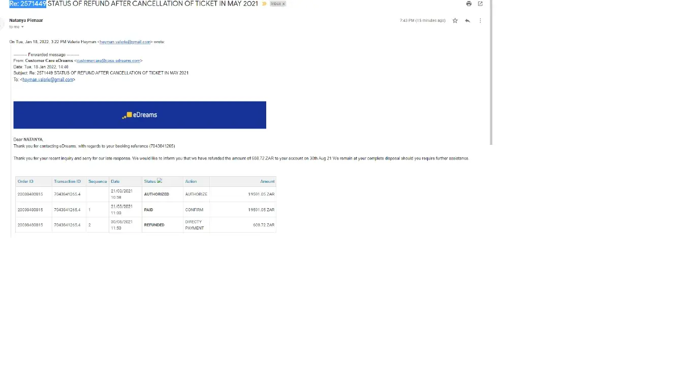 In April 2020 I booked a flight to SA with Ethiopian Airlines through EDREAMS. The flight was cancelled due to Covid-19. To date, over 2 years later, I have not yet received any refund from EDREAMS. The firm keeps saying that the refund is stuck with the airline, so they cannot do anything about it. I would greatly appreciate any advice and support.