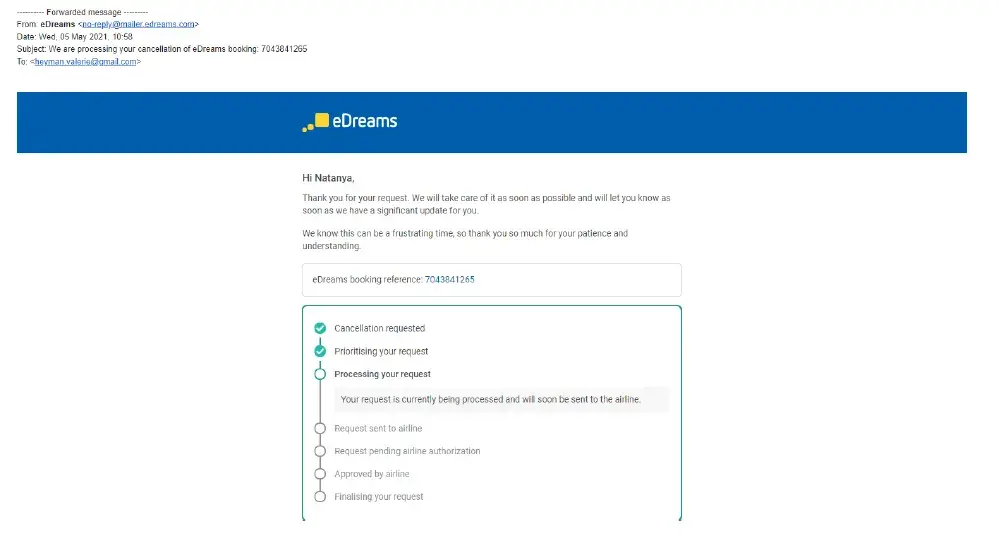 I requested then the cancellation, and eDreams informed me that the request has been forwarded to the airline, and can take up to 3 months.