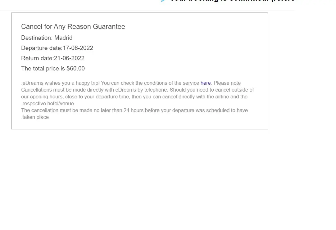 It seems eDreams has advertised that travel Insurance is good for sickness and covid but only if you know these things 24 hours ahead of time. If one is symptomless as we were that is impossible to know. They have completely misrepresented how useful travel insurance is and seem to want to just pocket your money.