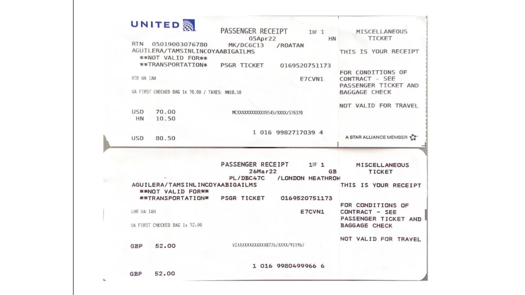 For our outbound flight. £52 was paid (receipt attached) so that we could check in one of our bags and take with us items that cannot travel in hand luggage.