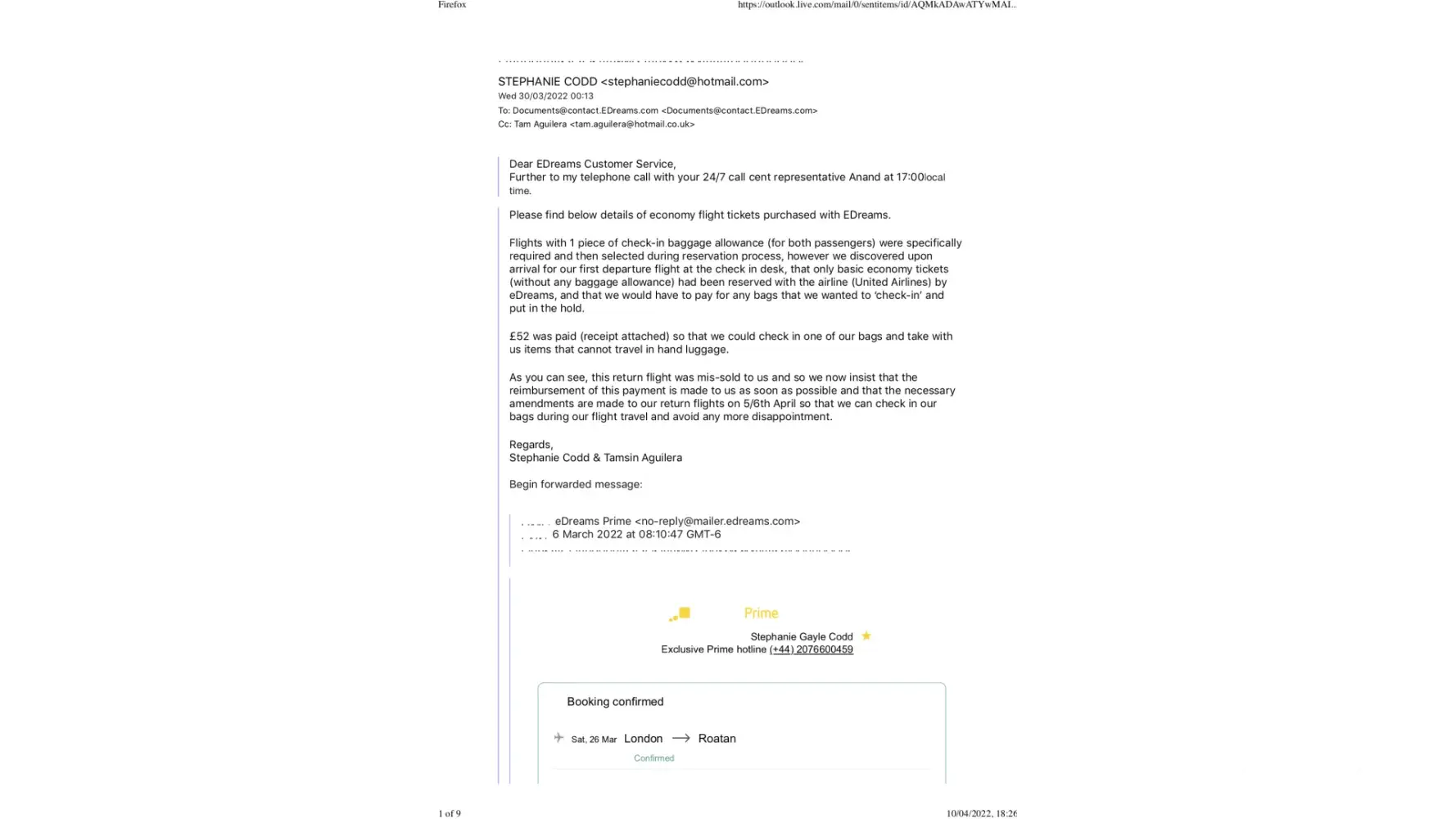 Flights with 1 piece of check-in baggage allowance (for both passengers) were specifically required and then selected during reservation process, however we discovered upon arrival at LHR for our first departure flight at the check in desk, that only basic economy tickets (without any baggage allowance) had been reserved with the airline (United Airlines) by eDreams, and that we would have to pay for any bags that we wanted to ‘check-in’ and put in the hold.