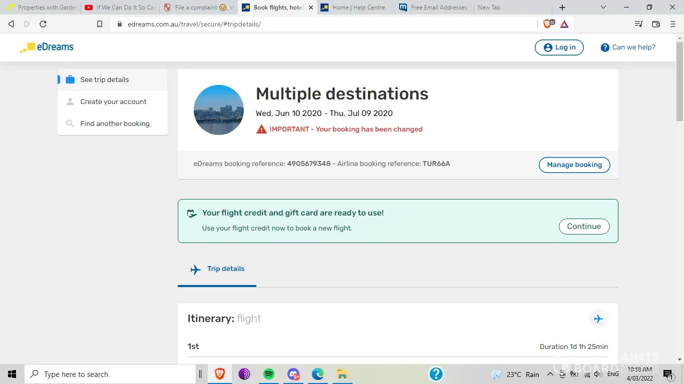I made a multi city booking with Edreams. A flight from Heathrow to bali on the 12th of September, a second flight from bali to Melbourne on the 26th of September. Due to an error my booking didn’t go through but the money was taken. The first flight was refunded instantly but the second flight still hasn’t been and Edreams are now claiming they didn’t take the money.
