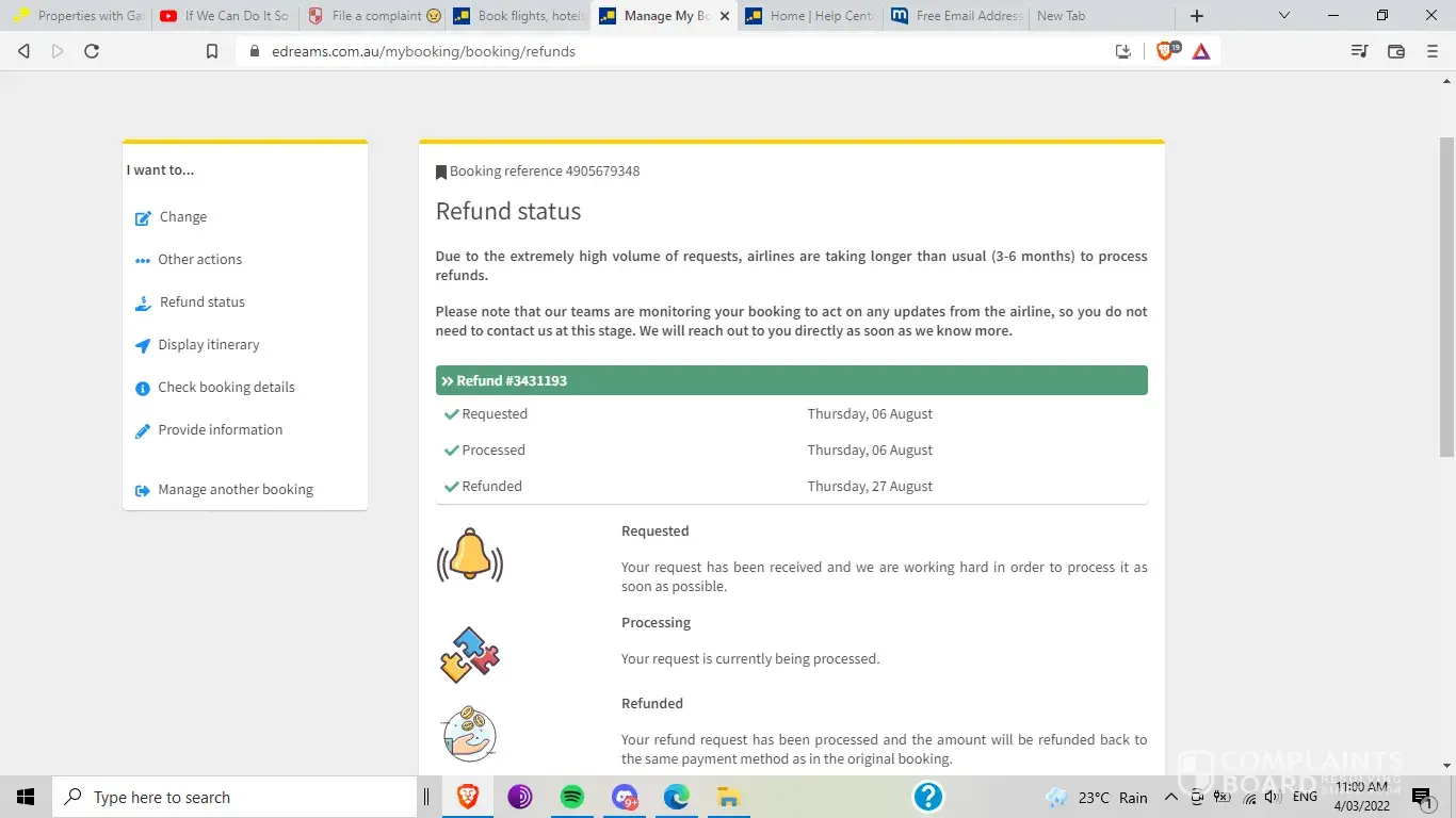 Desired outcome: Respinse fro eDreams and money refund