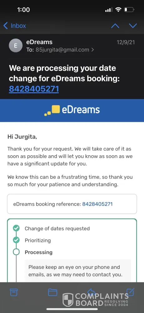 On Sep 1, 2021, at 4:44 PM, eDreams Customer Service Team wrote: