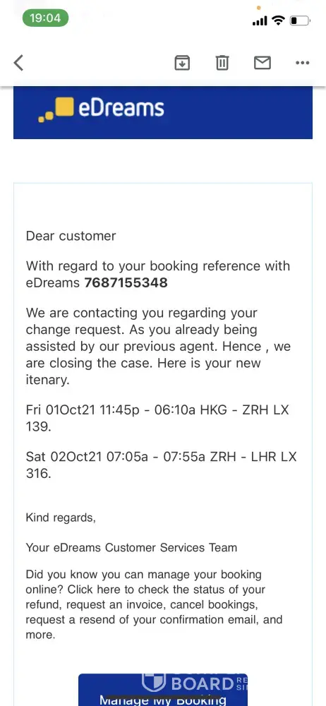 My booking reference is [protected]. I asked to change my flight to 1st Oct 2021. I received a call from eDreams on 22nd Sep and they told my change request has been approved and I received a confirmation email (pls review the attached files) on the same day. However, my flight was cancelled and I called the Swiss Airlines who told me that eDreams didn't issue my tickets after confirming the change of my flight. I contacted eDreams about this and they told me that they don't have this record. I forwarded the confirmation email to the email team 3 times but no reply. I called the hotline on 27th, 28th and 29th September and what they told me was keep on waiting. They promised they would get back to me but they never do that. My flight supposed is on 1st Oct, but I was told to keep waiting and no answer. And I've booked a hotel and covid test but I am not sure if I can fly on 1st Oct. Also, I wasted a couple hours to deal with this with the hotline. It seems I am helpless at this moment. Very disappointed with eDreams service.