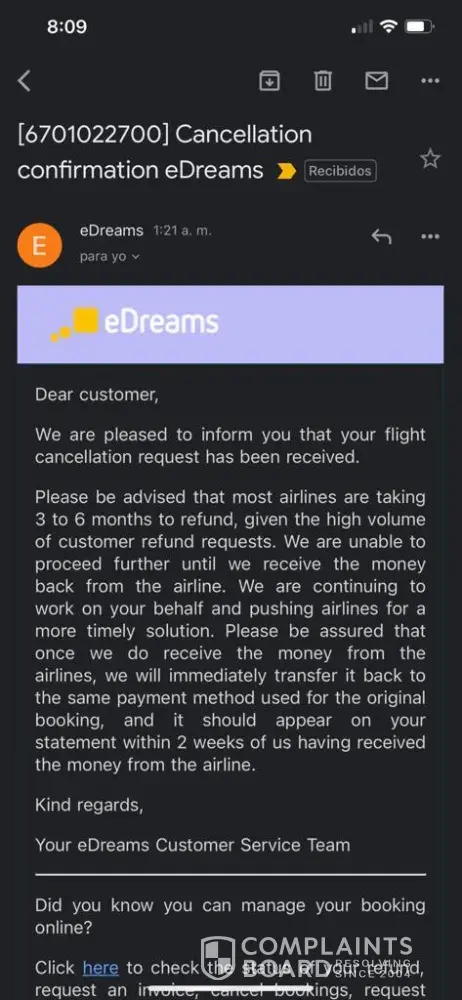 But I never received, when I called edream to check, answer was still pending refund from the airline and automated massage was an error.