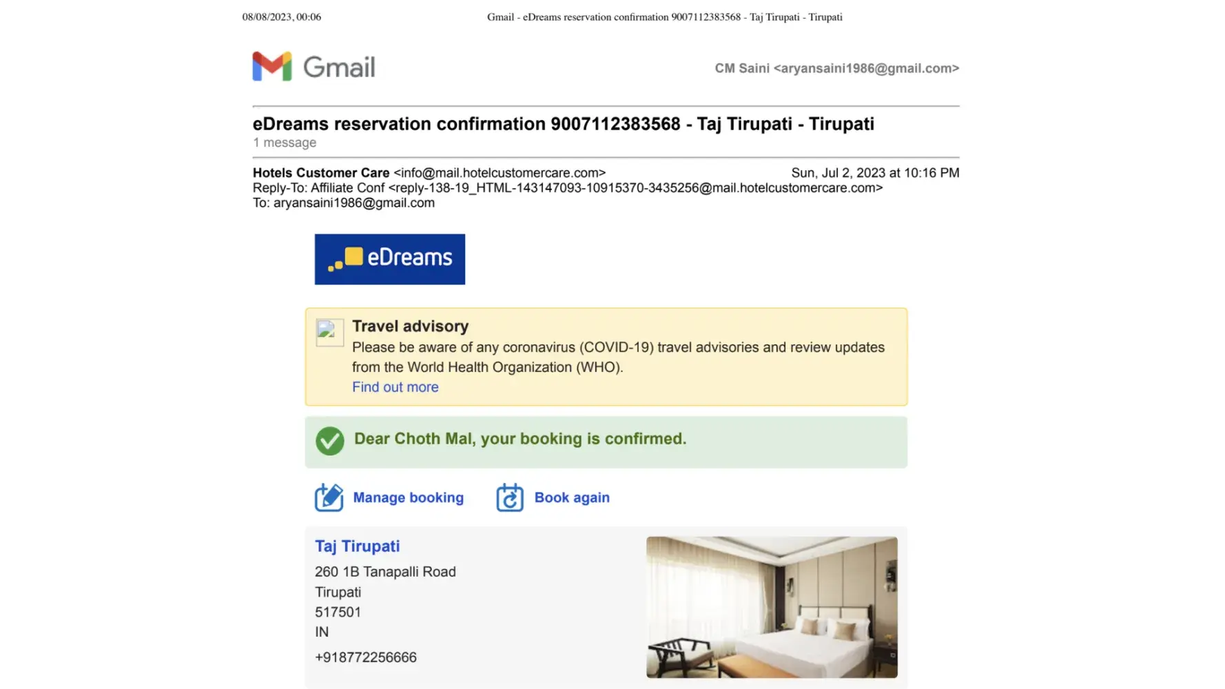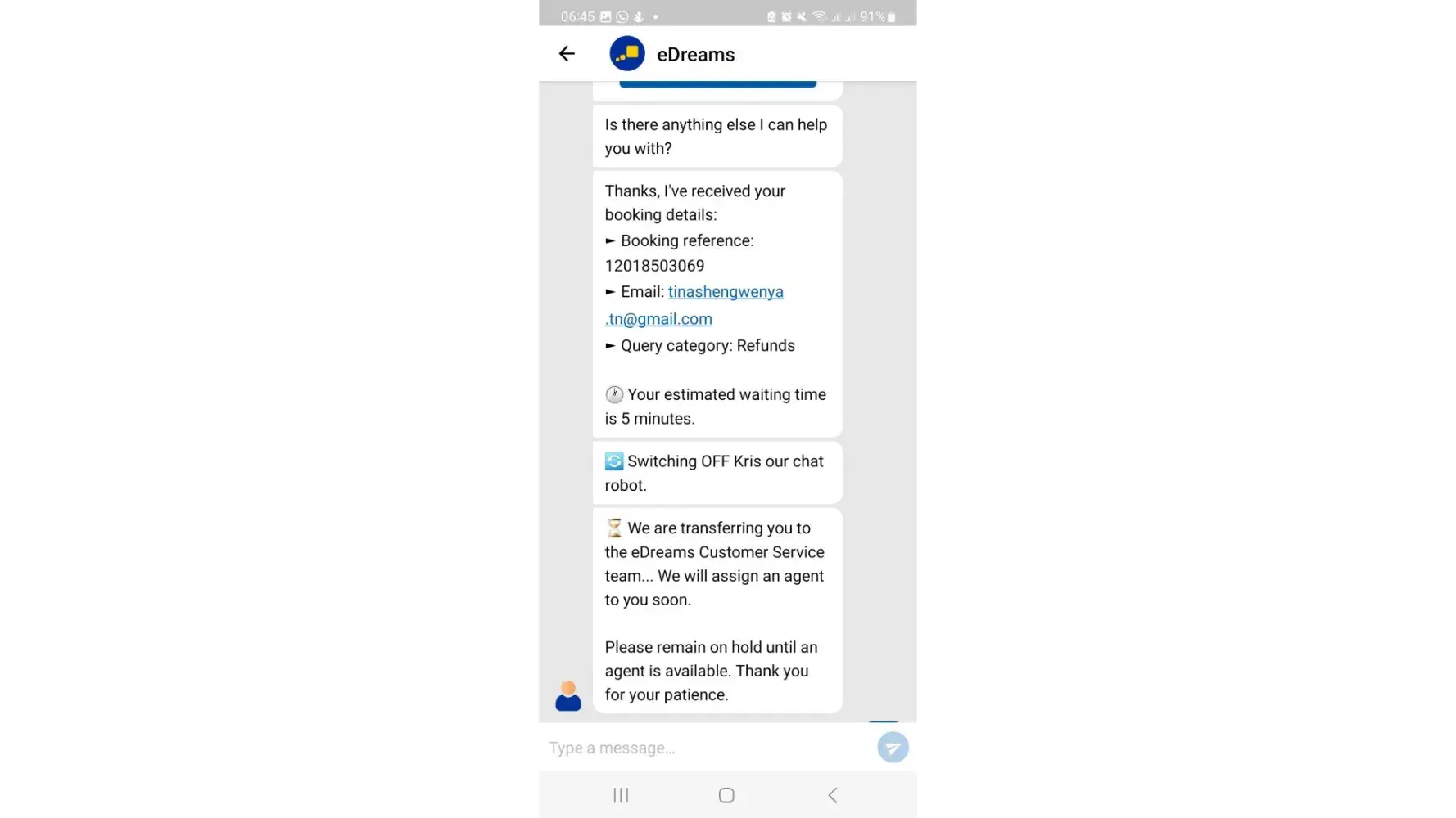 A few days later, I got one more email eDreams customer support person(Mohammed) saying that I have to reach out to Booking.com for my refund. He provided me Booking.com contact no +[protected] in the email to get my refund. As per Mohammed's suggestions, I called Booking.com and they said we don't have such booking details and any partnering with eDreams.