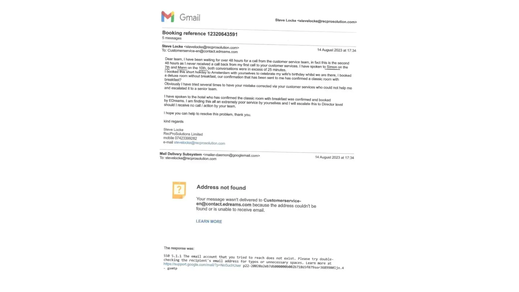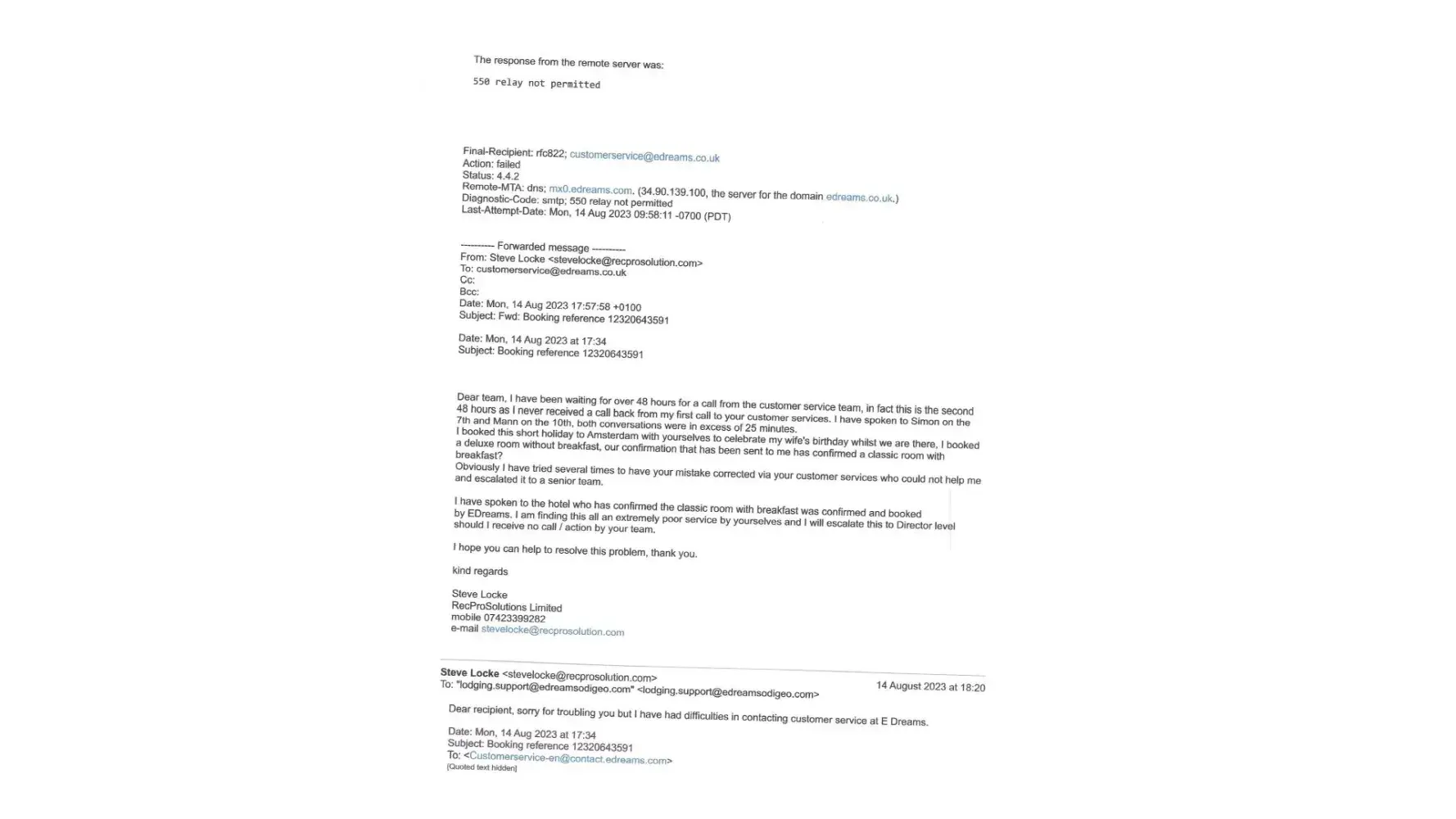 I have copies of emails sent to the advertised email address of E Dreams which were bounced back, plus the 2 separate calls made to the customer service team where I was promised a call back but never received either?