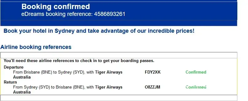 I phoned home for some phone numbers as there wa nothing evident on my booking reference. The international number did not work so my husband went home and spent nearly an hour trying to get the tickets properly released. E dreams were clearly reluctant to confirm the tickets and tried ot make me take a later flight. Why I might ask? I was at the checkin desk. Finally just as check in was closing they reluctantly issued tickets. I can only assume that they are operating some sort of scam. I have tried to complain in England but nobody has contacted me with a call back