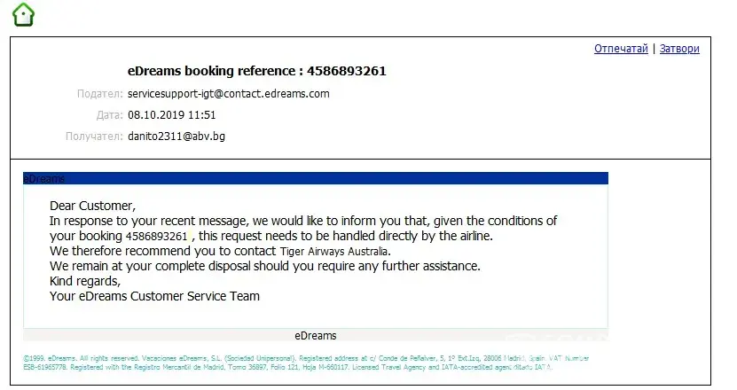 On Wednesday, October 9, 2019, 10:14:42 AM MST, eDreams Customer Service wrote: