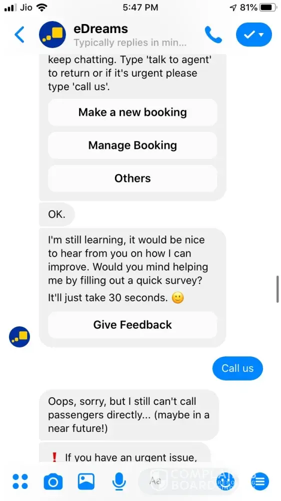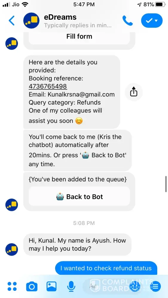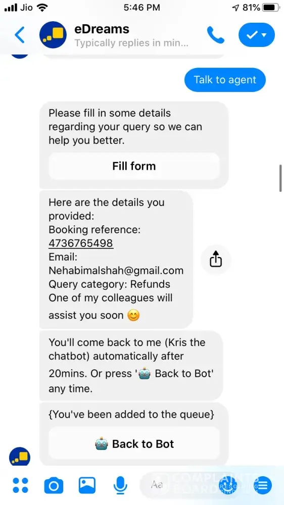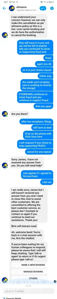Who are you talking to? This site isn't affiliated with the company, it's basically a review site... Get in touch with the eDreams customer service :)