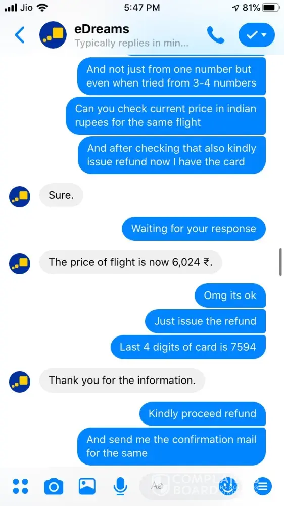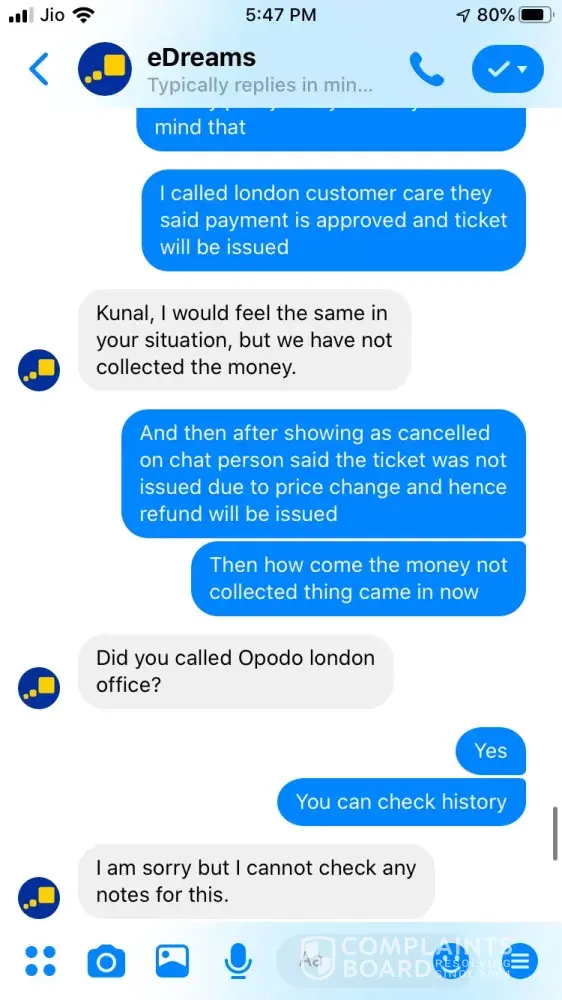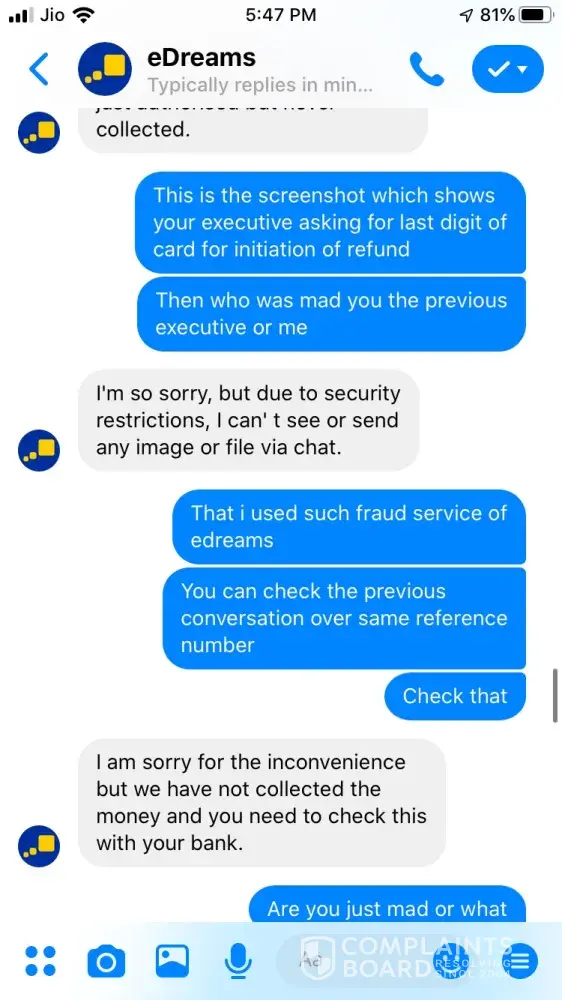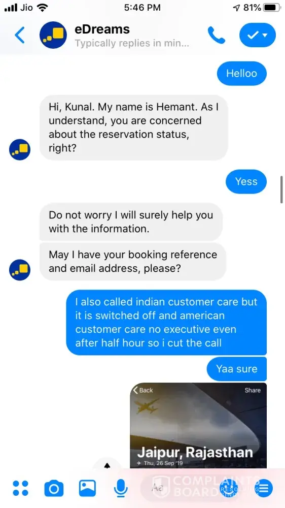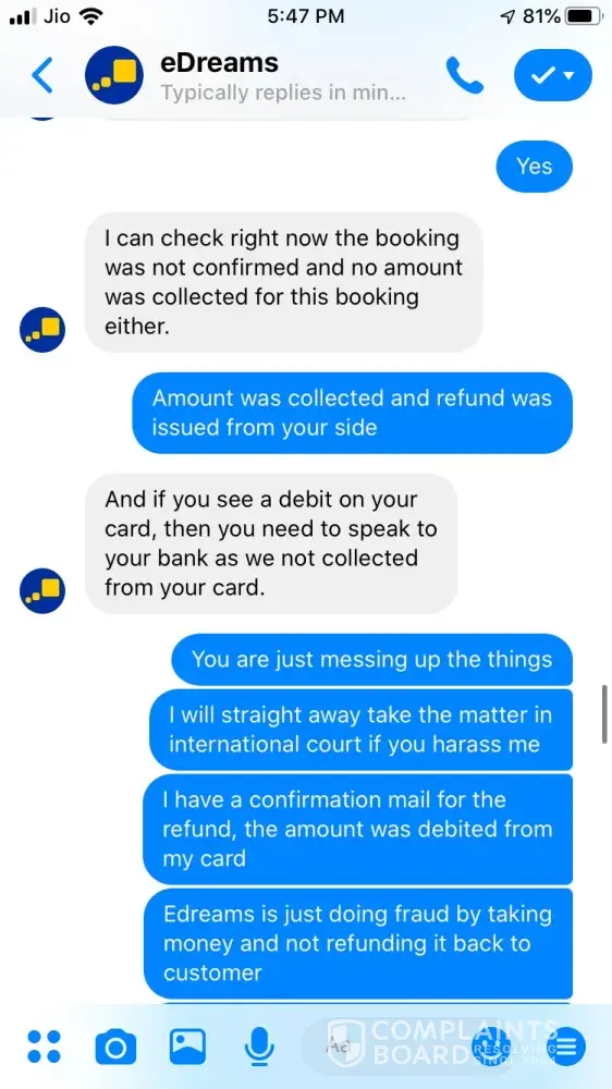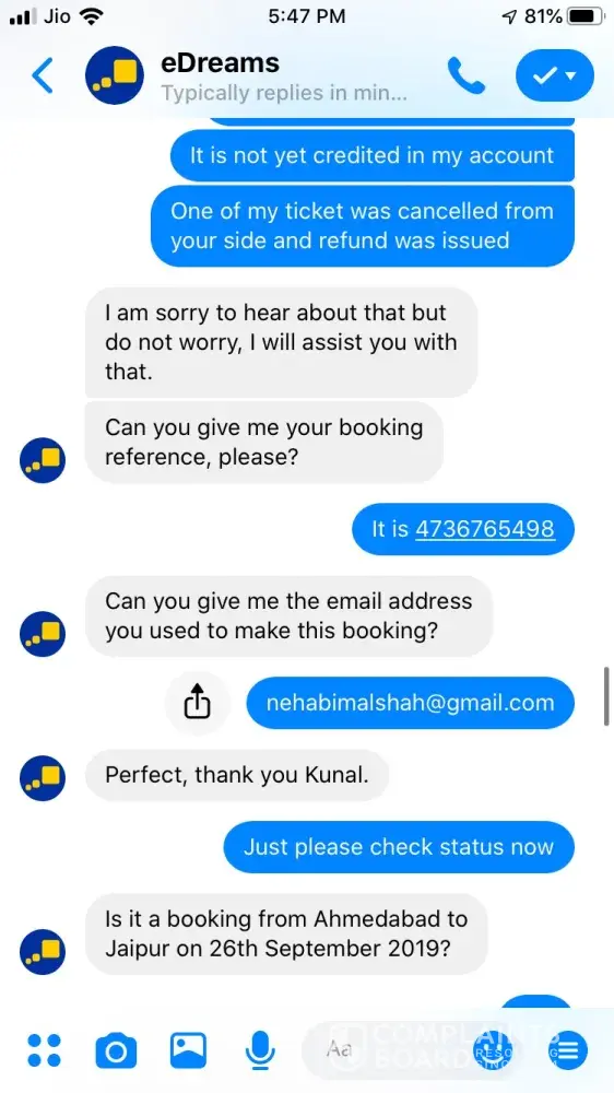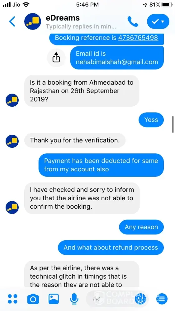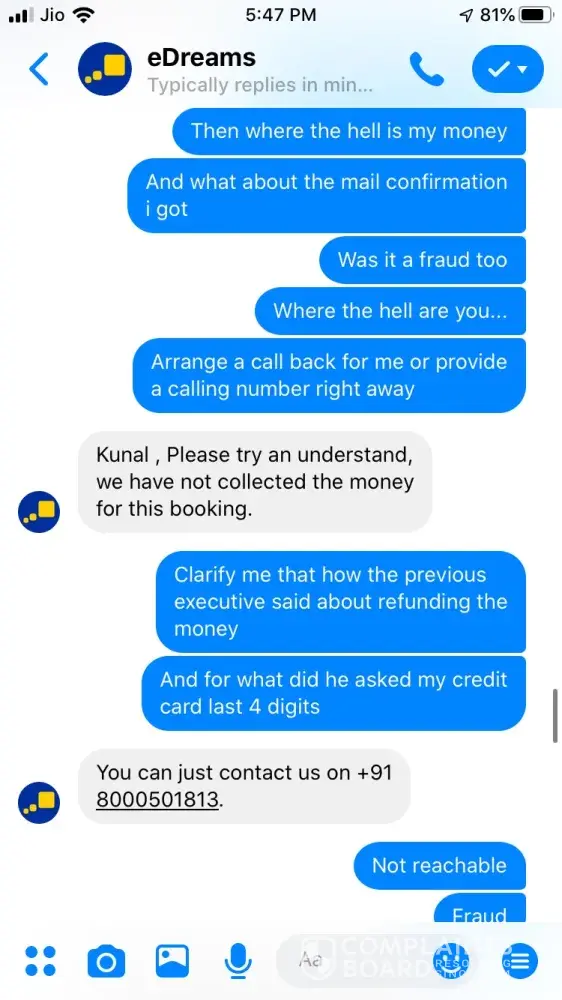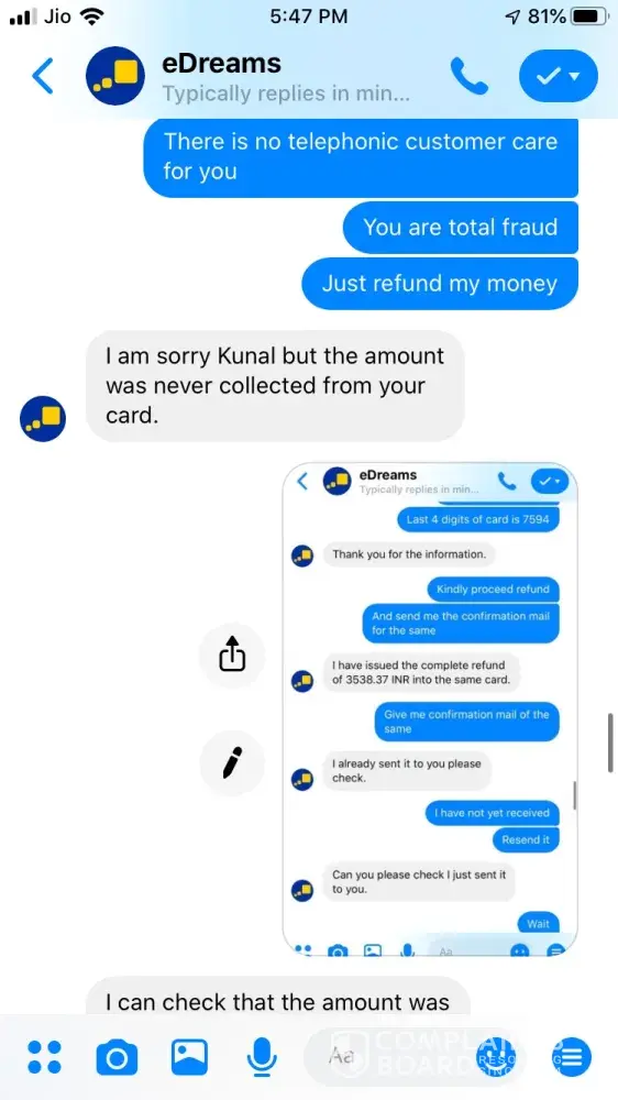 I tried booking a ticket on 24 September for Ahmedabad to Jaipur 26 September vide booking Reference Number [protected] and paid 3538.37 for the same. The transaction was in process for about an hour and then I called of +448000261530 and after half hour an executive picked up and said ticket could not be issued and it will be issued the payment is approved. After a while it showed that trip is cancelled, I tried calling but no customer care was reachable, Indian Numbers displayed on website are simply fraud. I reached them through messenger and after two turns one executive named Hemant got connected he said booking was not confirmed due to technical glitch and now price has changed so refund will be issued. He asked for last 4 digits of my card used for booking and send a confirmation mail stating that refund is initiated and will be credited in maximum 7 working days. The money is not credited to my account and I did not received any communication from edreams so I contacted again through messenger and the executive Ayush says money is not collected hence ticket is not issued and hence team has also cancelled refund. I am very harassed and guilty after using such fraud agency services. If my problem is not solved within a week from this complaint I am going to file criminal fraud case against edreams at international consumer forum. Hereby attaching whole chatting for ready reference