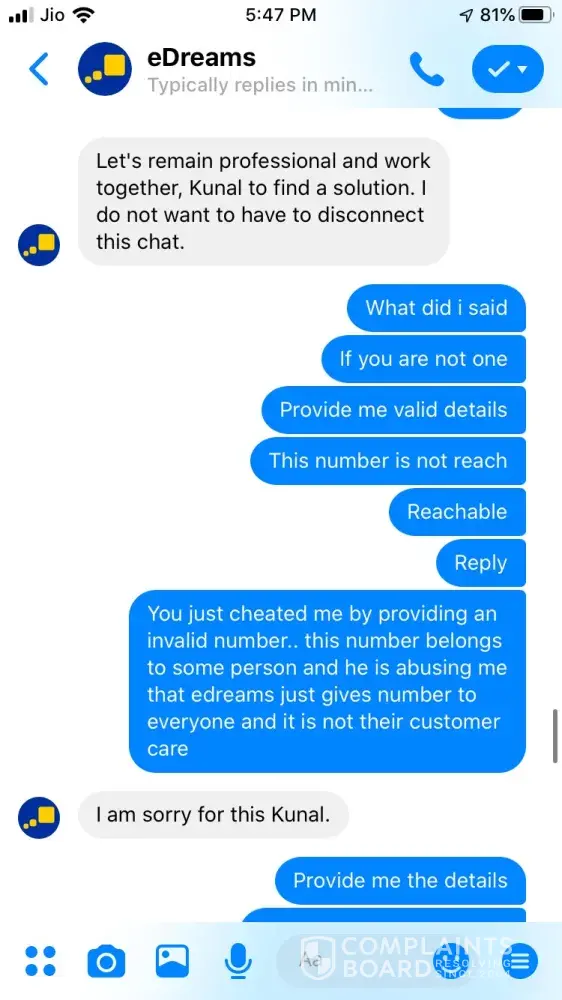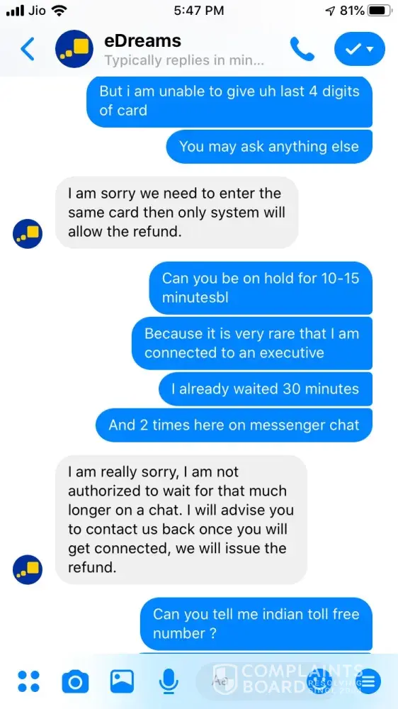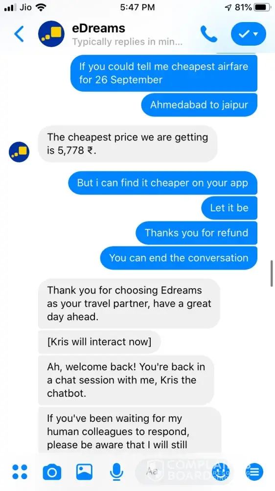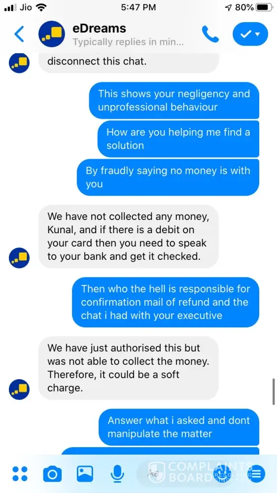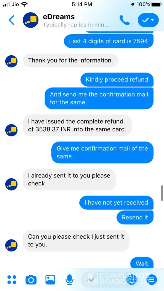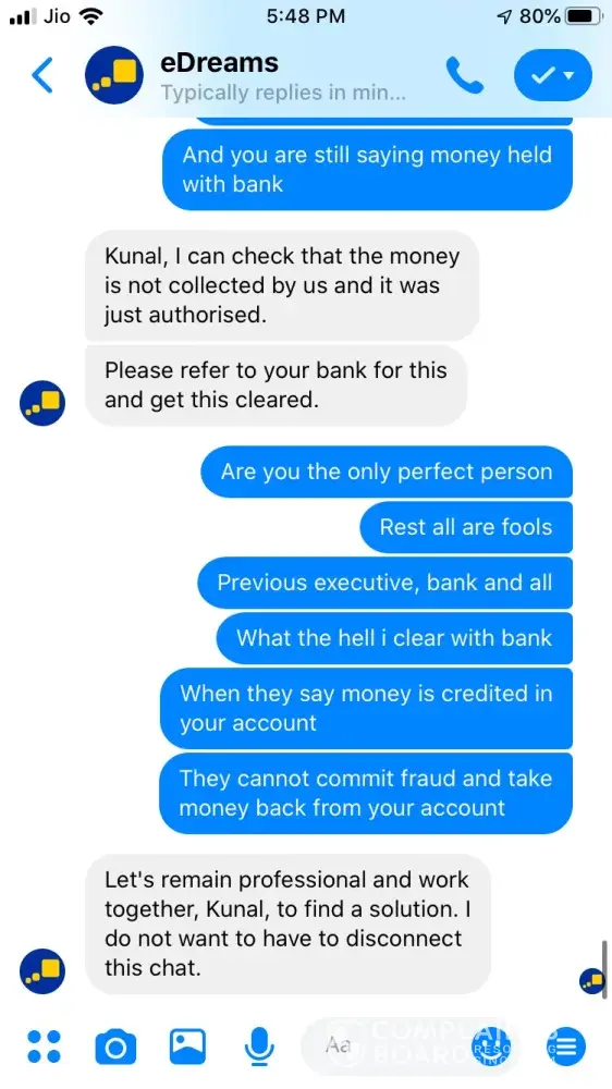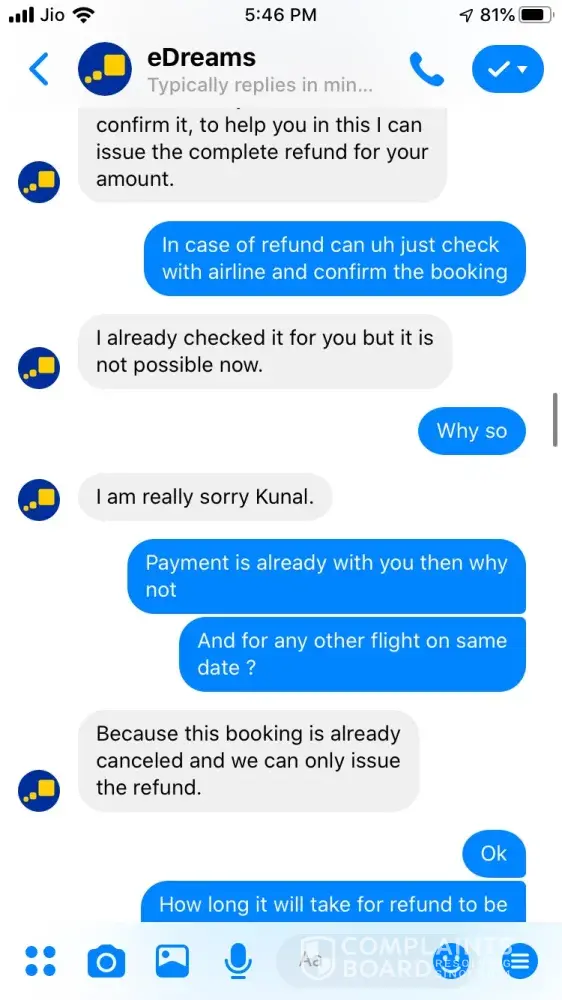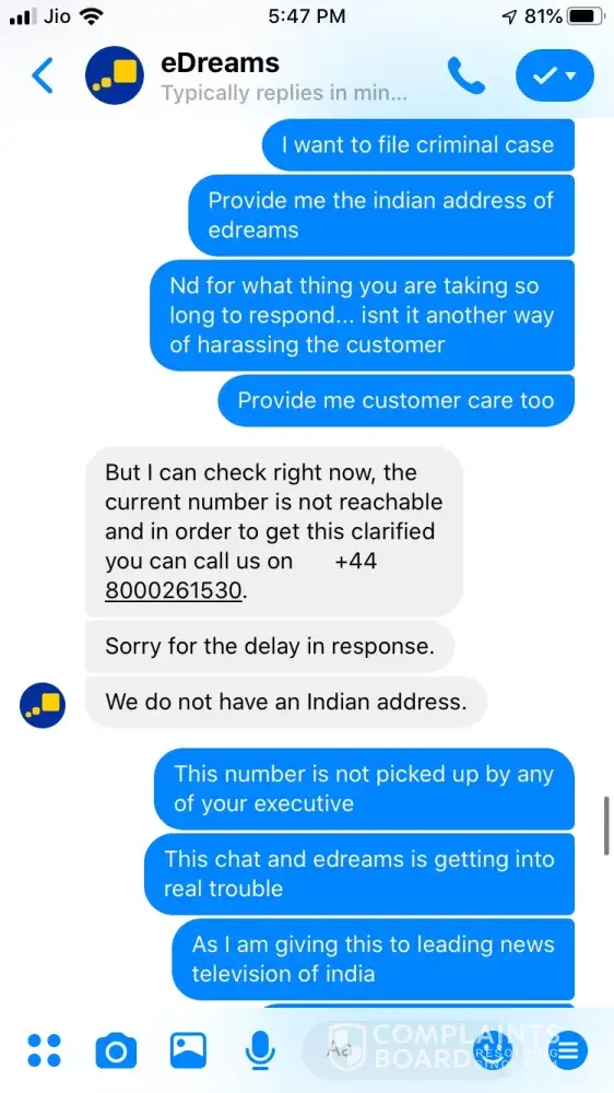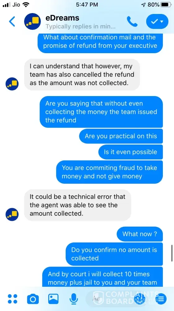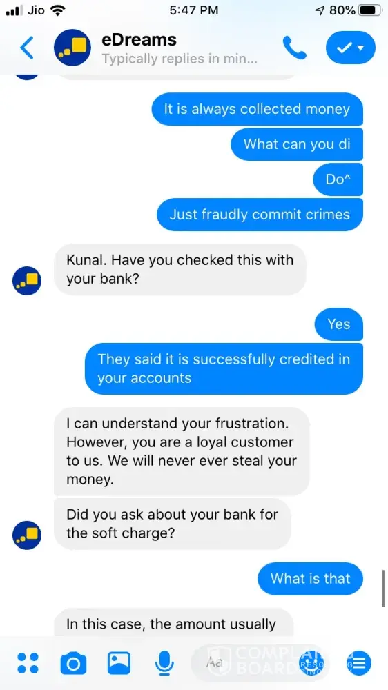 I tried booking a ticket on 24 September for Ahmedabad to Jaipur 26 September vide booking Reference Number [protected] and paid 3538.37 for the same. The transaction was in process for about an hour and then I called of +448000261530 and after half hour an executive picked up and said ticket could not be issued and it will be issued the payment is approved. After a while it showed that trip is cancelled, I tried calling but no customer care was reachable, Indian Numbers displayed on website are simply fraud. I reached them through messenger and after two turns one executive named Hemant got connected he said booking was not confirmed due to technical glitch and now price has changed so refund will be issued. He asked for last 4 digits of my card used for booking and send a confirmation mail stating that refund is initiated and will be credited in maximum 7 working days. The money is not credited to my account and I did not received any communication from edreams so I contacted again through messenger and the executive Ayush says money is not collected hence ticket is not issued and hence team has also cancelled refund. I am very harassed and guilty after using such fraud agency services. If my problem is not solved within a week from this complaint I am going to file criminal fraud case against edreams at international consumer forum. Hereby attaching whole chatting for ready reference