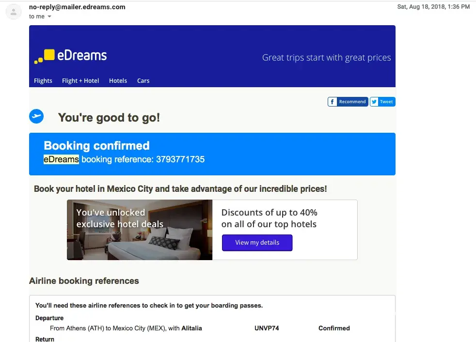 I purchased a roundtrip flight from Athens to Mexico (Dec 23- Jan 20, 2019) from the eDreams website. I bought my ticket as early as August 18th, 2018 so as to get an affordable price- being on a student budget.