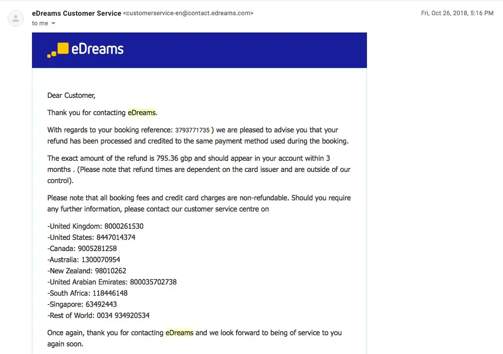 Has anyone else had this problem with eDreams?! If so, how was it resolved?
