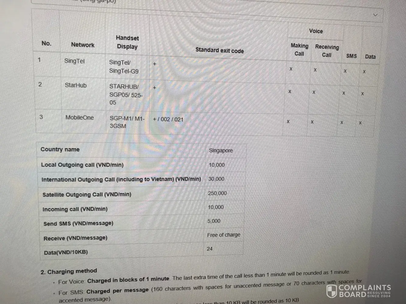 1/ Overseas call in 30 minutes for roaming charge from Singapore to USA: (Vietnam Dong) VND 30.000/minute (quoted per attachment and the link from the operator Mobifone: http://mobifone.vn/wps/portal/public/dich-vu/quoc-te/quoc-te-list/cvqt-thong-thuong/!ut/p/a1/hY9dT4MwFIZ_TS-7HtgH07squjBGNjeJwI0pWGgjtqwr-PctJjNm8eNcnK88ec95SUEyUig2yIZZqRVrx7lYPG92G99bzfwY4sQDSmM_DIH6h51H1v8BGcl9k9wmDSk6ZgWWqtYkq4ajxVZo1bjcu0KeSHEhtU59JzVL0_RxP_WC-SWwjdMAaHS_jB6ubrxtFPwNrMIzAL8EhdFO0-ry03lOVTldur8Nr7nhZtIbtxbWdtcIELzpUtZa8cmgELx3JwSdNpa1rvZlKysEL7ISeOgRHHtdYcu_GlwJia3kFoFzz3HJND7LYcOwGjHVaCZ_ekPokyXZt_Okey3Kxf6uTuw8_wDFJXc6/dl5/d5/L0lDUmlTUSEhL3dHa0FKRnNBLzRKVXBDQSEhL2Vu/