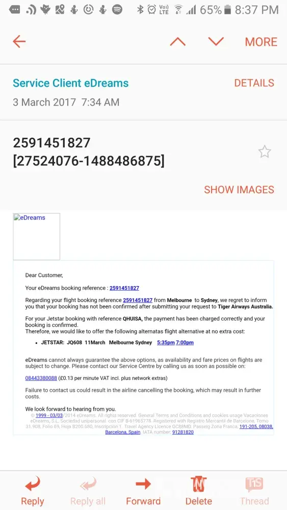 I have been emailed saying that a flight was unavailable but because I have paid the fare Edreams are going to give me a different flight at no extra cost but the phone number given to confirm it doesn't work please help in finding out what flight I can board on the 11th of March 2017 from Melbourne to Sydney. I am really stressed out and wish I hadn't used your services as it is impossible to get hold of agent. I just want to check in to a flight on the 11th of March 2017 even if it's not at the time I requested but HAVE PAID FOR.