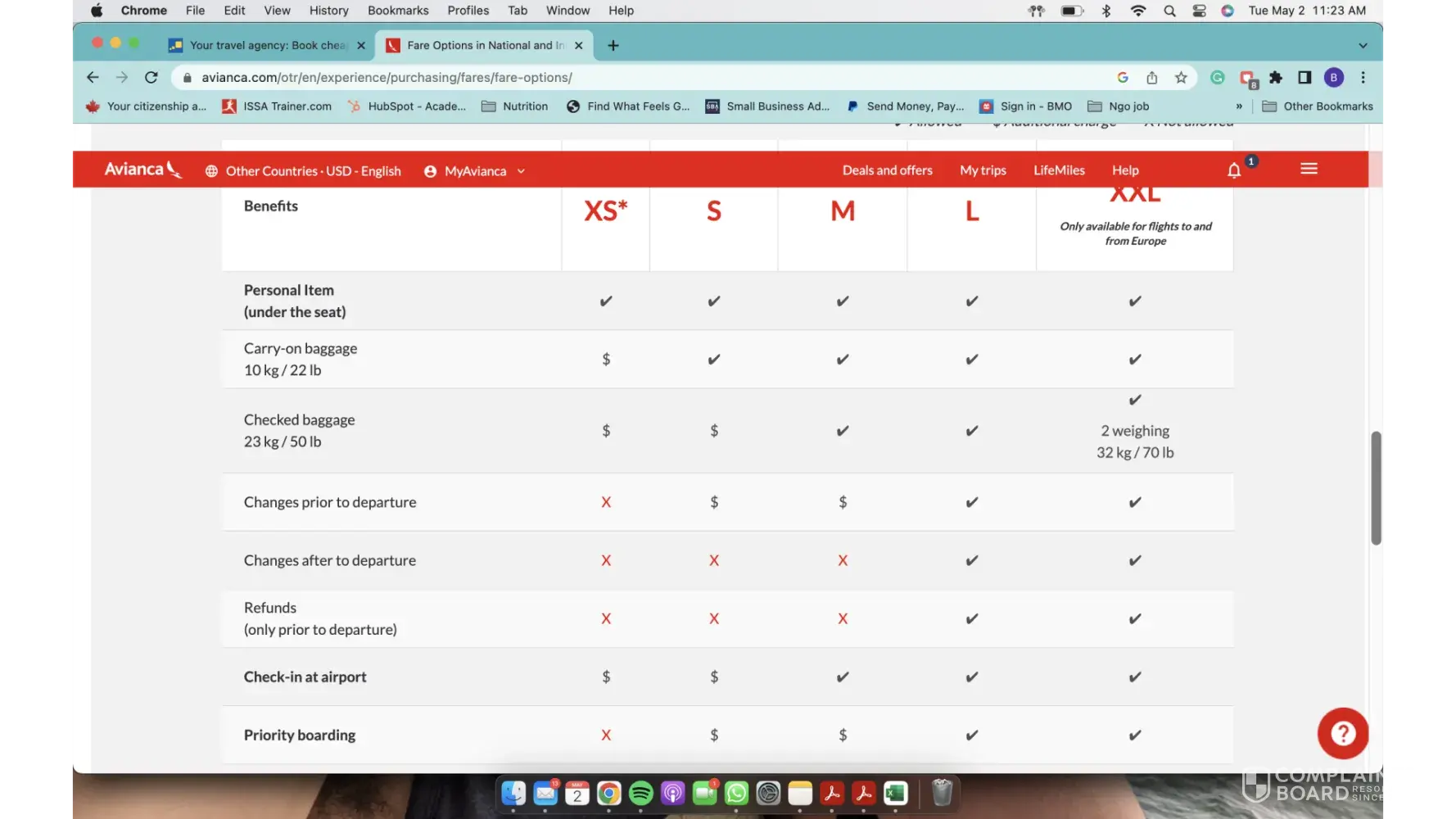 The booking was confirmed to include “hand luggage AND flexibility to modify the reservationâ€. This ticket is advertised as a class size S (as per Avianca) We were then issued (directly from the airline) boarding passes with class size XS.