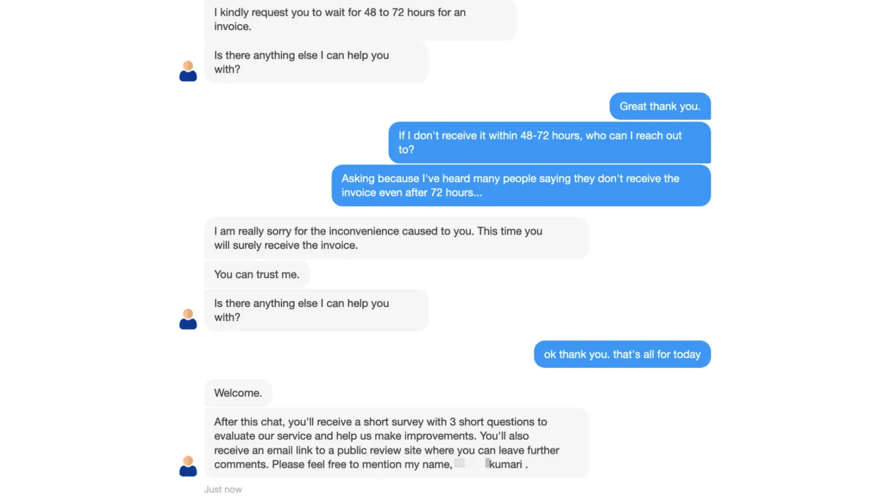 I chatted with an agent who was extremely confident I would get my invoice (see screenshot). They said I would receive an email link to a public review site where I could leave further comments. No, I haven't heard from them a single time after making any requests or chatting with their agents.