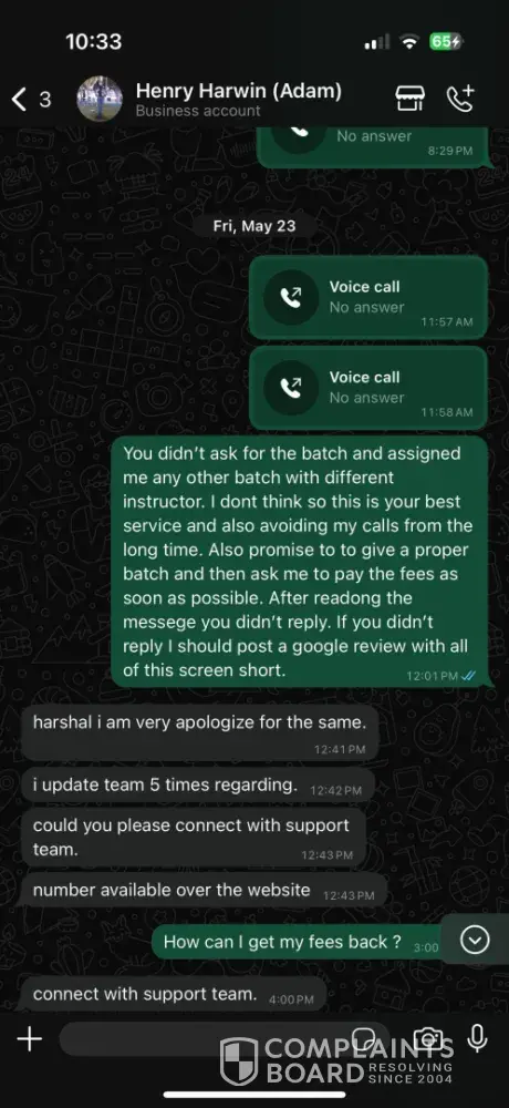 I paid my fees abound 1 and half month ago and the relationship manager informed me $400. Then he told me $600. But I only pay $400. After paying my fees without attaining any lectures I asked for fees return but no one responding. They promised me a batch with particular faculty at particular time. They lied to me about that. Then they not assigned any...