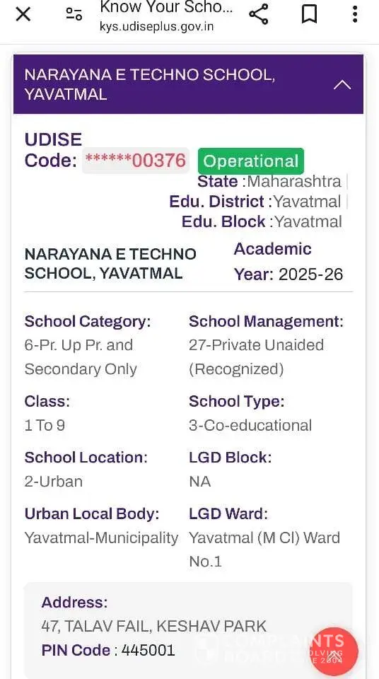 Read full complaintNarayana ETechno School Yavatmal - Naryana school yavatmal affiliation status misleading for 2 years