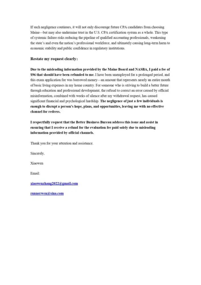 I am an international CPA candidate who applied for exam eligibility in Maine. Misleading information on the Maine Board and NASBA websites caused me to apply under incorrect assumptions. On November 21, 2025, I requested via email to NASBA and Maine CPA coordinator Perceita Beasley to stop the review and refund my $96 fee. Before they even started...