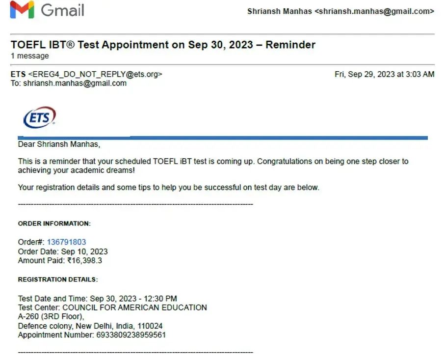 Not allowed appear in TOEFL exam, (Delhi, India) - Appointment Number: [protected]