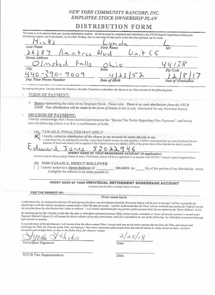 I had an IRA account with Edward Jones Berea, Ohio for many years. On 2/18/18 I received documentation from New York Community Bank (my former employer) to rollover my ESOP funds to Edward Jones, Berea. My financial advisor, Greg, was adamant to complete the form and fax it back to New York Community Bank. I thought the funds form the ESOP Plans were going...