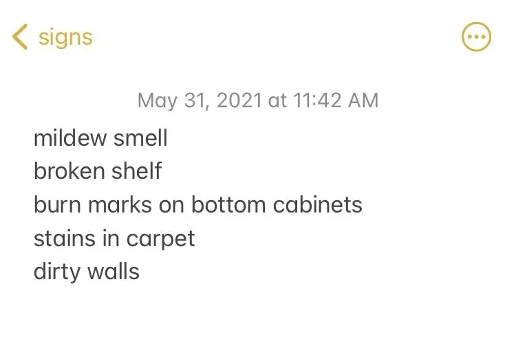 - Mold grew on my dresser after TWO WEEKS after moving in and it stained the carpet which wasn't even stapled into the padding underneath (padding was dirty and old, earwigs crawling everywhere). Maintenance told us to "just spray Febreze" and that "it smelled like coconuts" when they came to check out the mold issue.