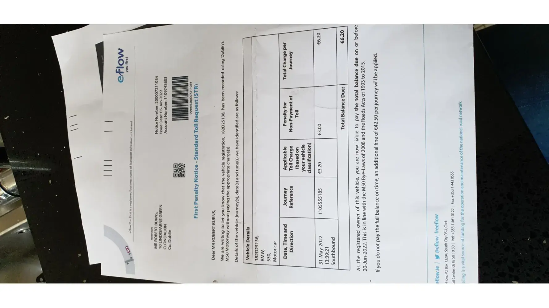 I received an unpaid toll notice from EFlow case number 23051 - [protected] for journeys that took place on 08/03/22 and 10/03/22 for car registration C2DJC