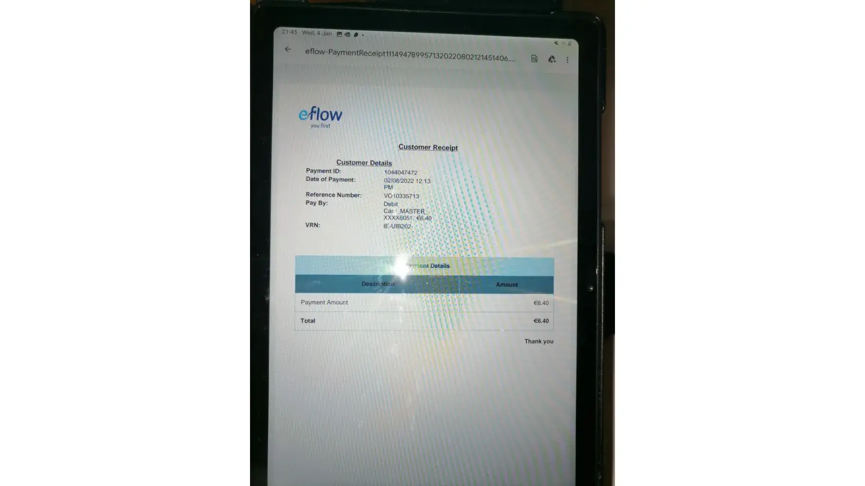 On Saturday 25th we made one journey from Belfast to Naas in vehicle reg (NI) GGZ5061 and one return journey on Sunday 26th. Each day we logged into eflow and paid the toll.