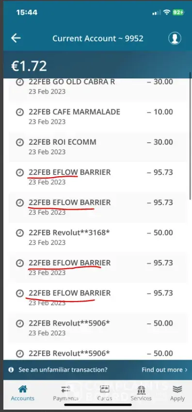 We attempted another 3 times before I used another card which worked fine, I then proceeded to check my account to notice that 382.92 was taken from eflow on top of the 95.73 that I paid with another card so in total over 478 euro was taken from me for a bill that should have been 95.73, I immediately called back as I had my car payment due the following day along with my rent and needed to get food and this left me with 1 euro in my account, the representative advised it was pending and this would be back in my account within the following few hours, which as im sure you assumed as I am following up did NOT happen.
