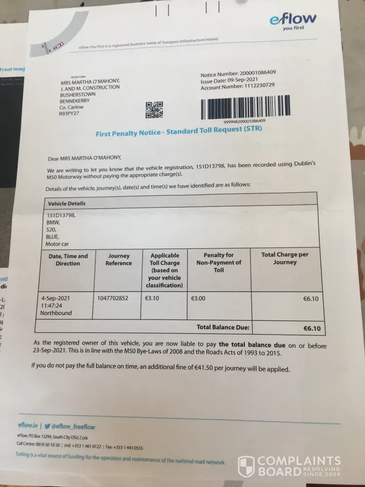 recently i have received penalty notice for two trip on M50. I have emailed on 4 occasions to eflow asking how this can be as they control the tag anf account without reply. I have gone through their appeal process and received notice of case number without resolution and now received a further second notice claiming the cost to be 49.80