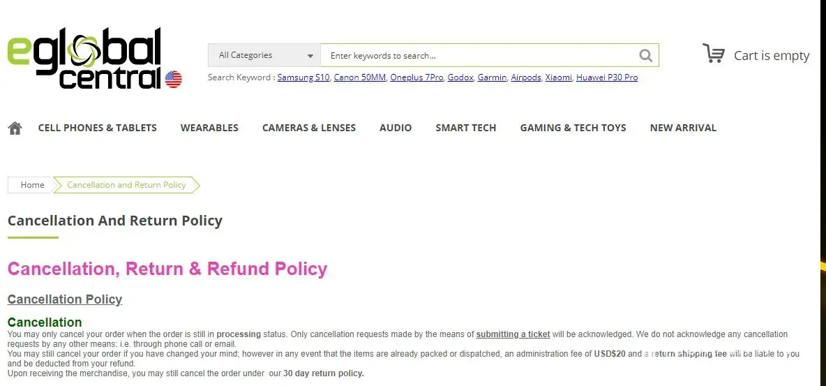 I ordered a smartwatch (amazfit stratos) from this website and by accident it was the wrong one I wanted on 6/8/2020. When I realized it immediately afterward I tried to cancel. Everything on eglobal centrals website says to submit a form through the provided hyperlink on various pages. However, these hyperlinks are nonfunctional, and do not lead to any form. I reached out on chat, and they responded asking for my email and the order number which I provided immediately. Moments later I received an email that the item was packed. So I responded to the email, that I wanted to cancel again. Then today I received an email it was shipped. All communications from eglobal again mention to goto the hyperlinks to cancel, but again none of these hyperlinks work. I have emailed eglobal 6 times with no response.