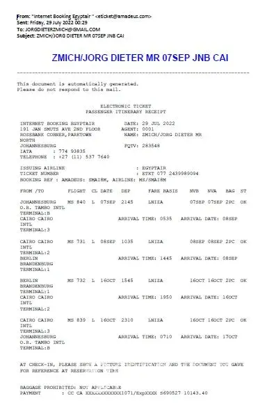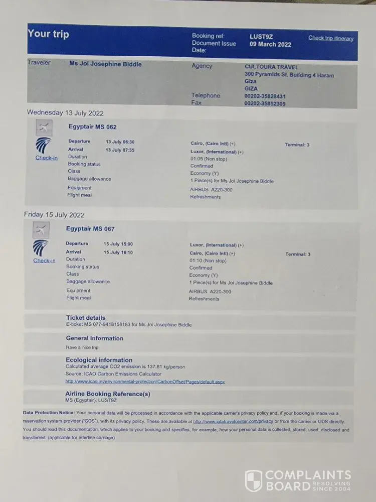 I look forward to a swift resolution to this matter and hope that my trust in EgyptAir's services can be restored.
