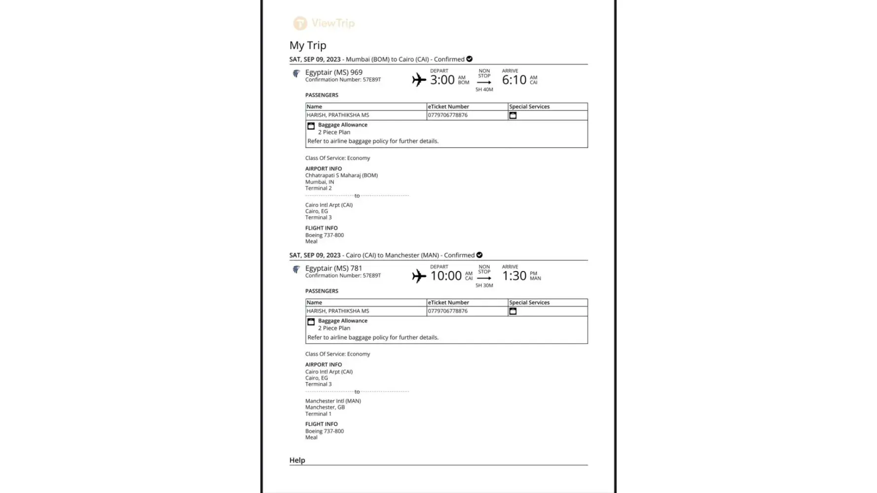 I travelled from Mumbai-Cairo-Manchester on the 9th of September on a