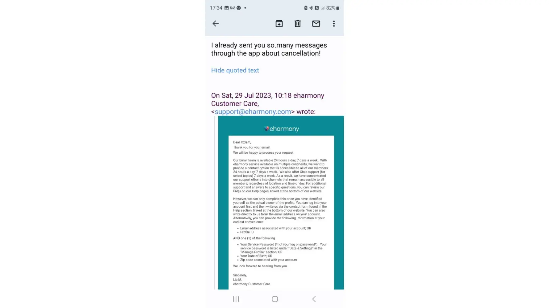 To my dismay, I have recently discovered that my membership has not been canceled, and I am still being billed for services I no longer wish to utilize. This is not only a gross oversight on your part but also a violation of the trust I placed in eHarmony as a reputable and customer-centric dating platform.